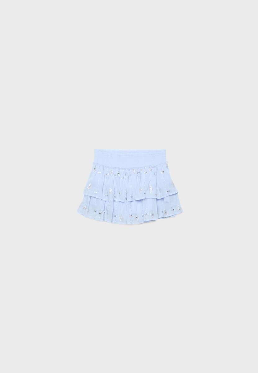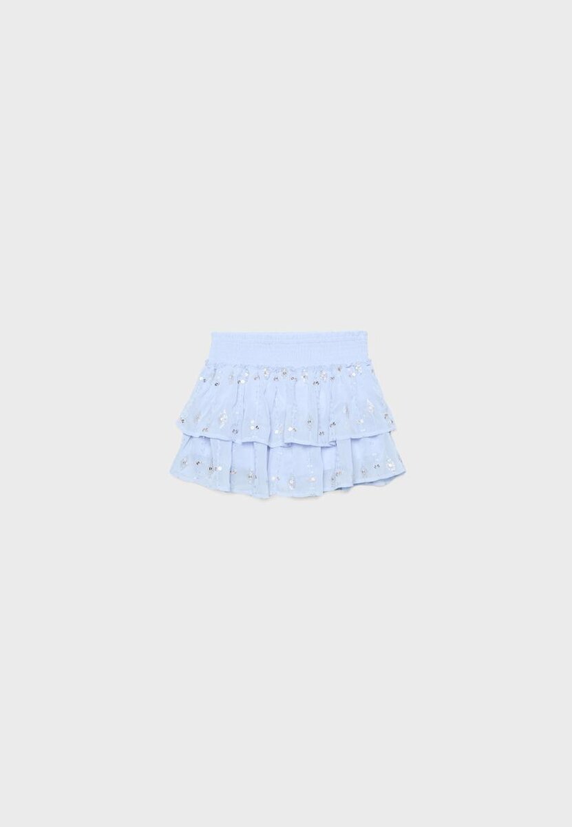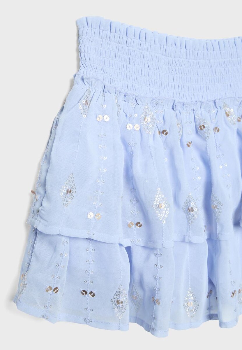Miniskjørt med elastisk smocket linning. Med volanger i kanten og perlebroderi. Tilgjengelig i en rekke farger.