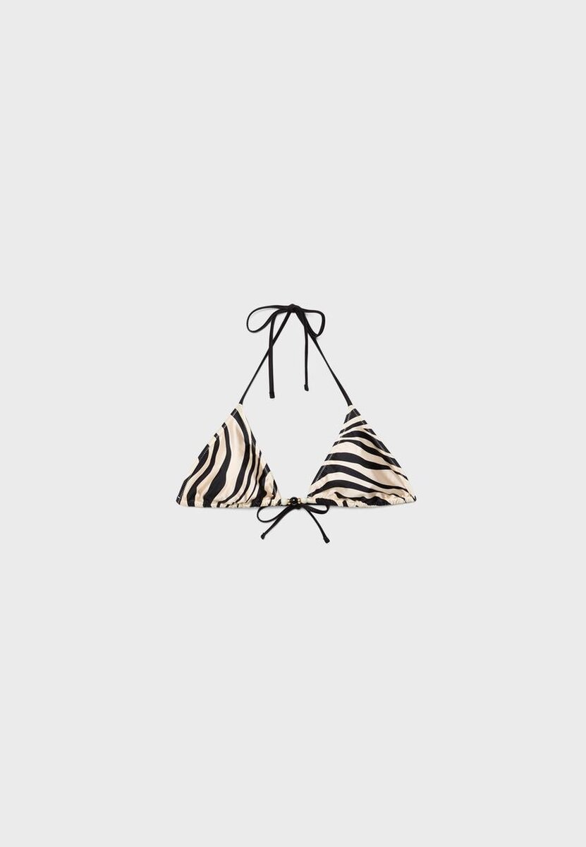 Justerbar triangel-bikinitopp med båndlukking i nakken og på ryggen, laget av stoff med sateng-effekt. Med mønstret stoff.