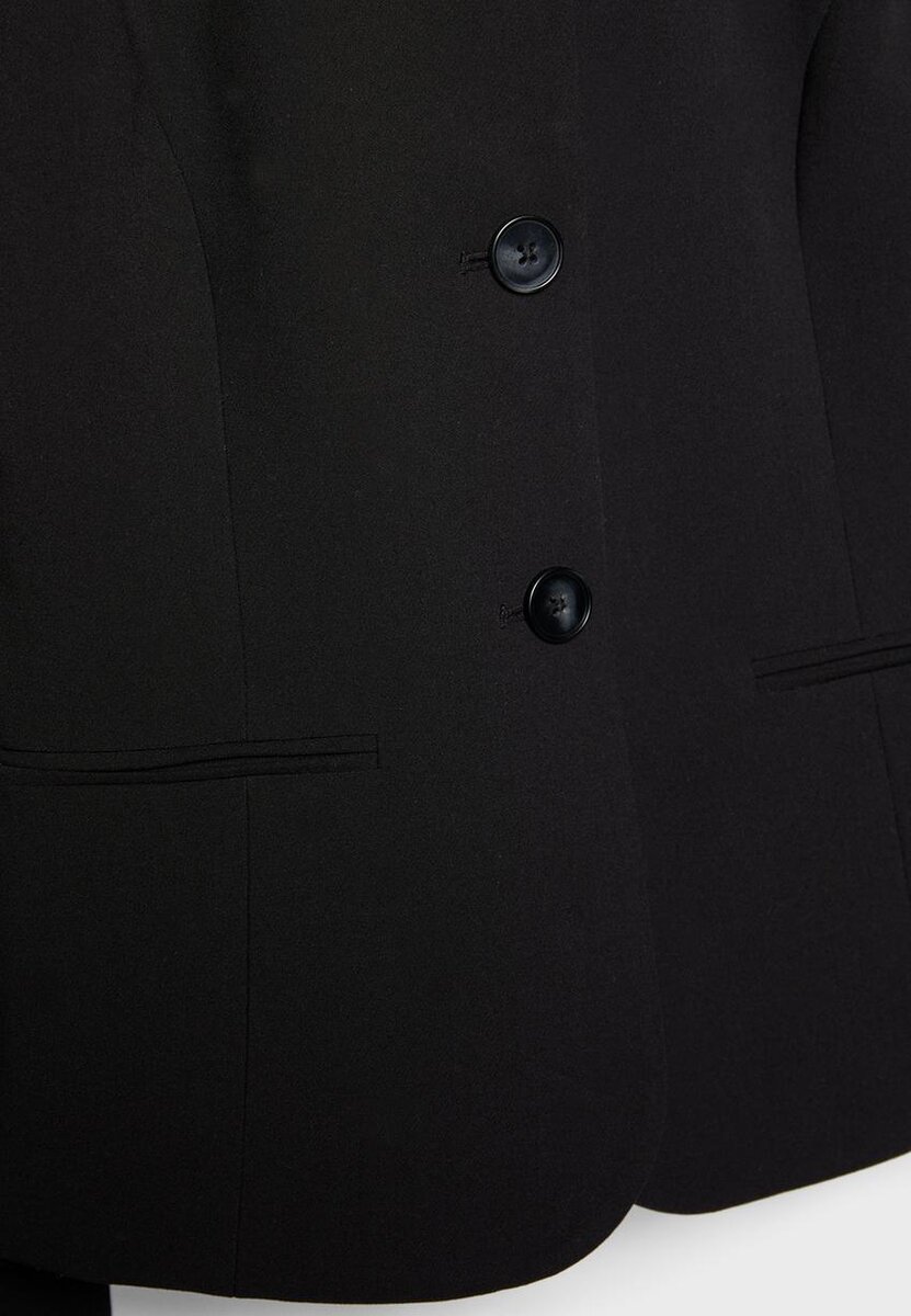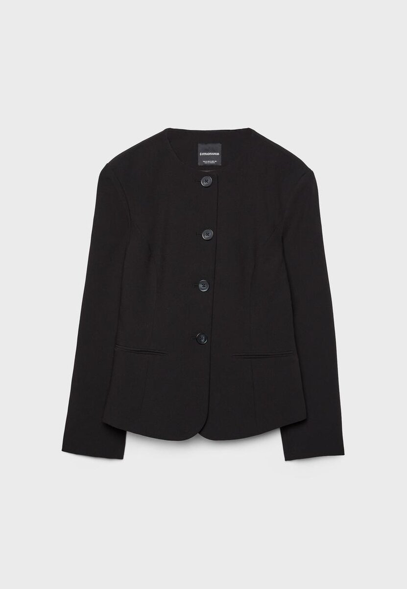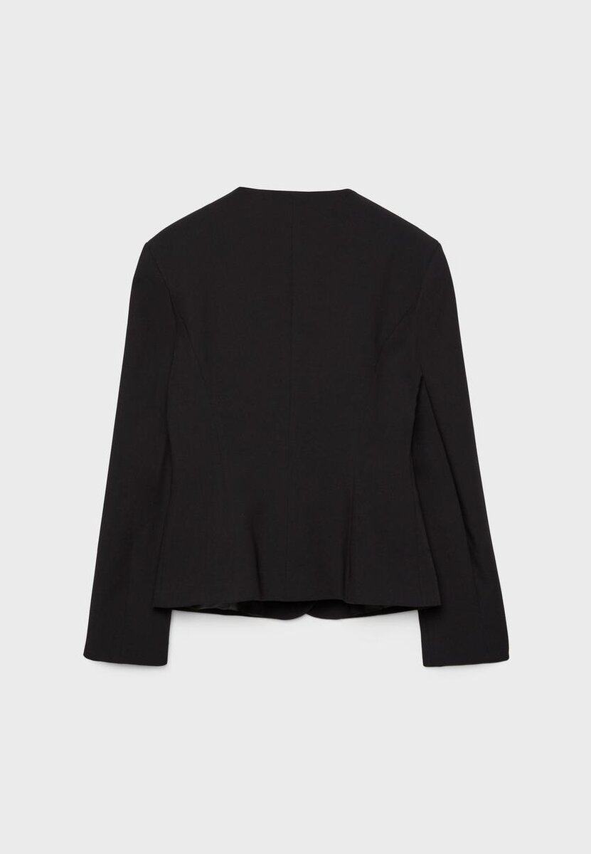 Blazer i standard lengde. Med rund hals og lange ermer. Lommer med kant foran. Knappestolpe foran.