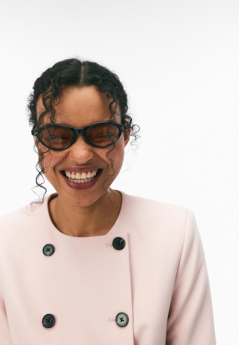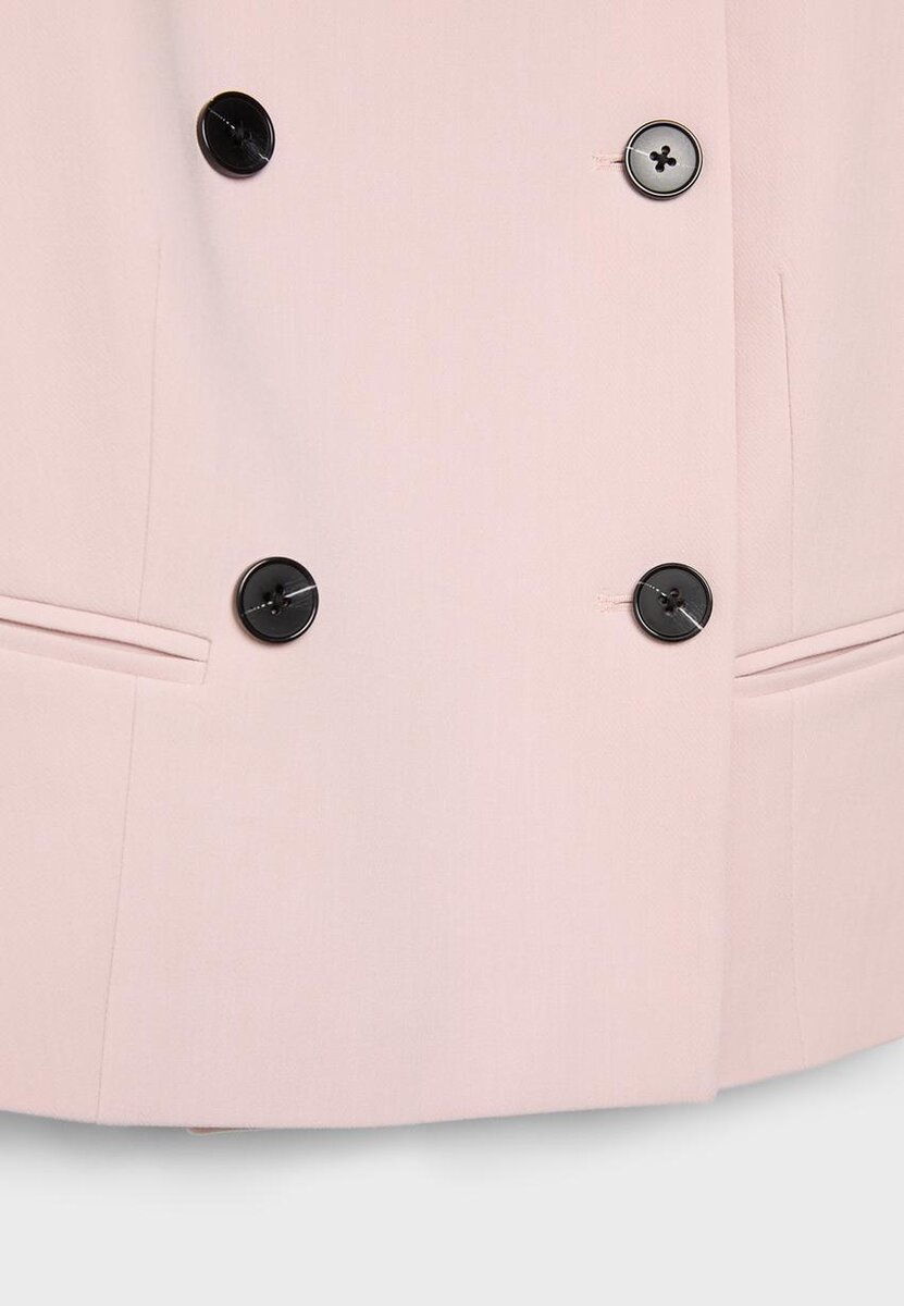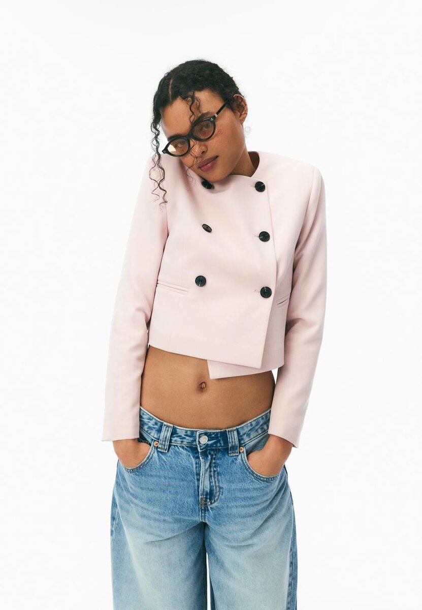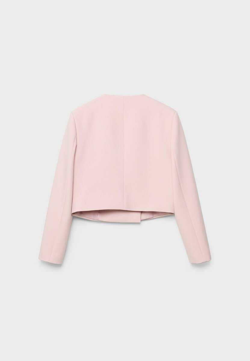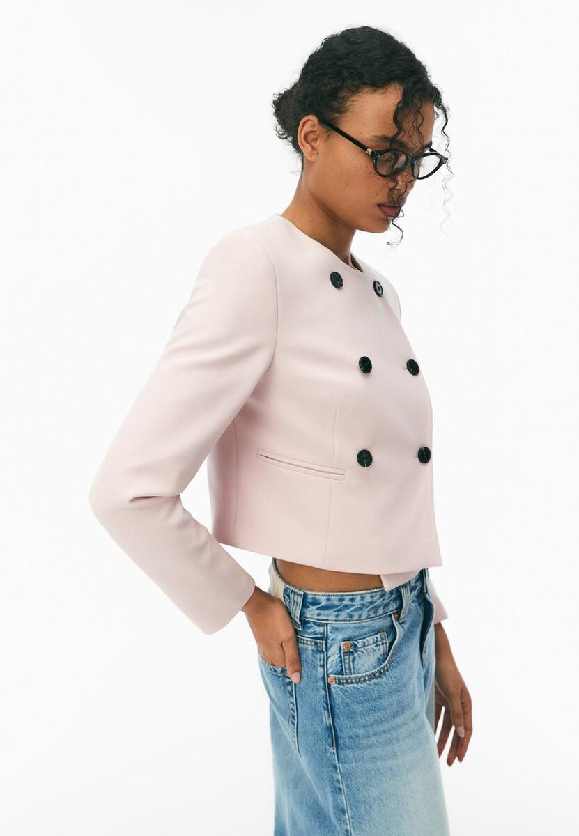 Kort blazer med rund hals og lange ermer. Med falske lommer foran. Dobbeltspent knappestolpe foran. Finnes i flere farger.