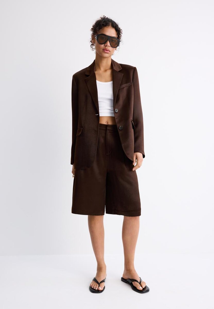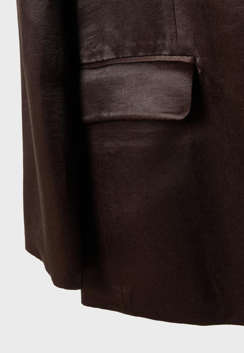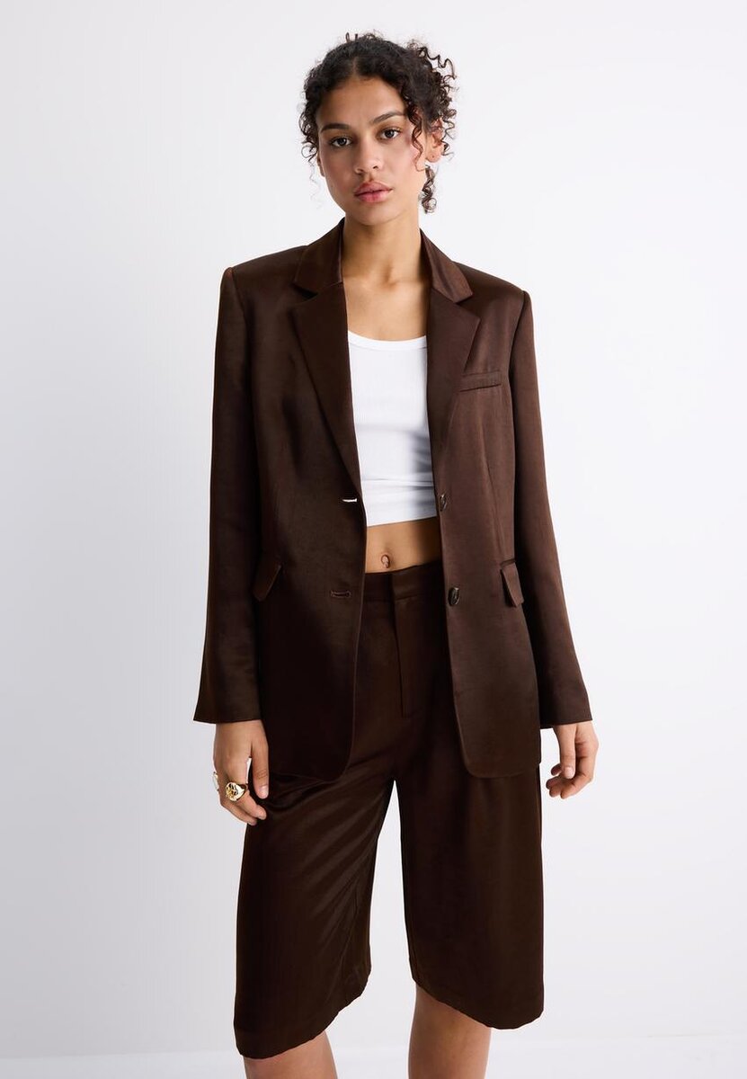 Blazer med rett passform laget av et viskoseblandingsstoff med satengfinish. Reverskrage og lange ermer. Paspolerte lommer med klaffer foran og en paspolert lomme på brystet. Knappestenging foran.
