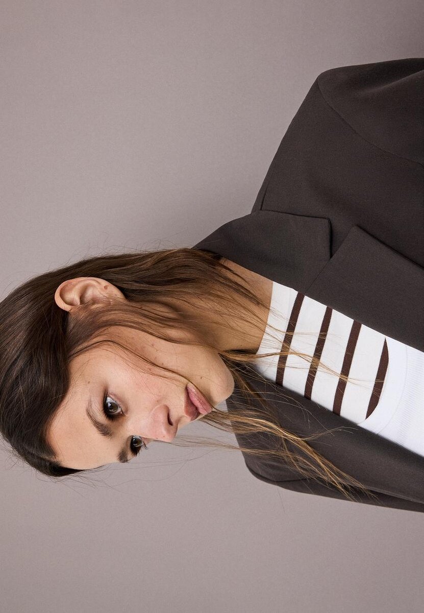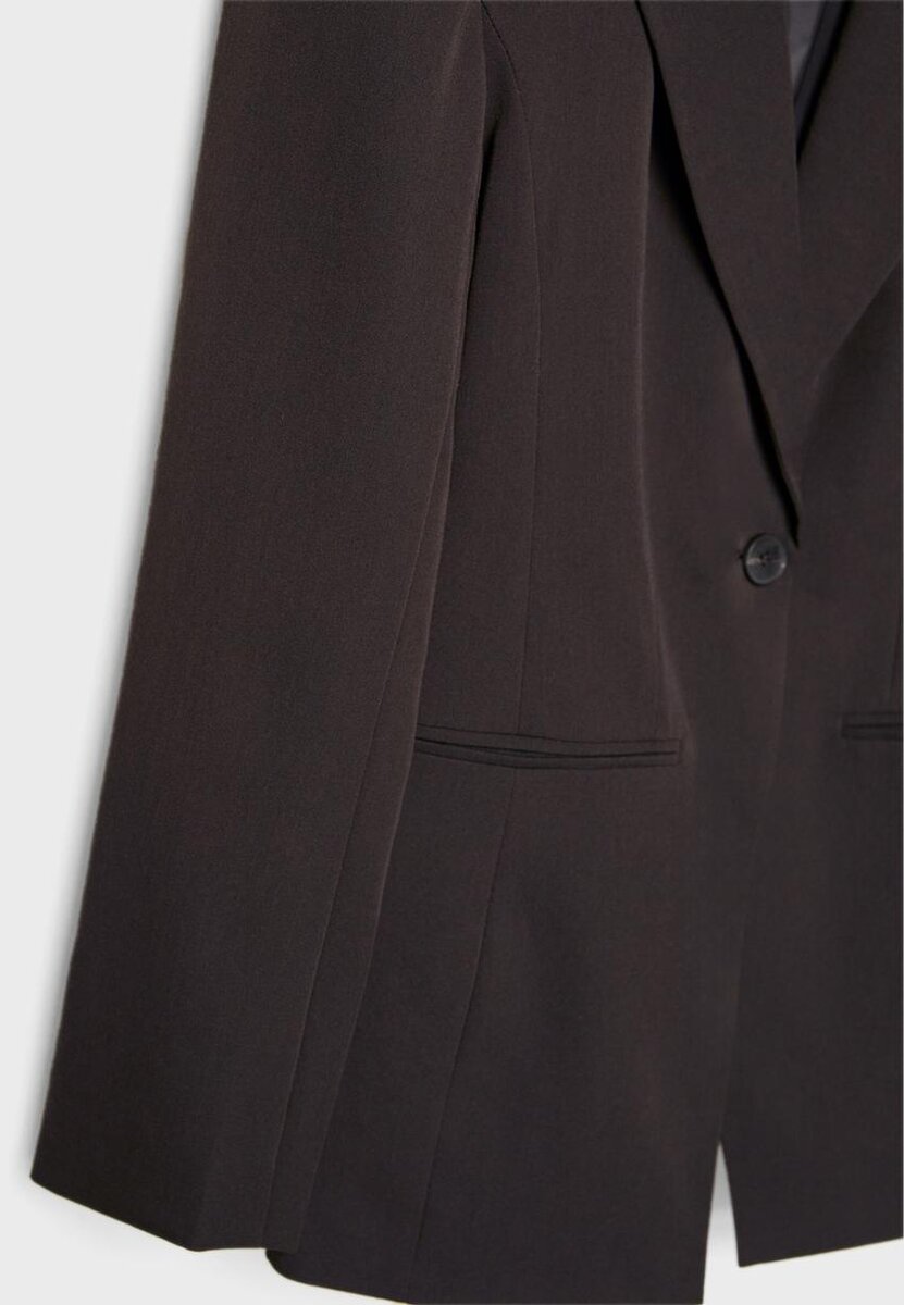Skreddersydd blazer med revers og lange ermer med knappede mansjetter. Dekorative lommer foran og på brystet. Knappestolpe foran.