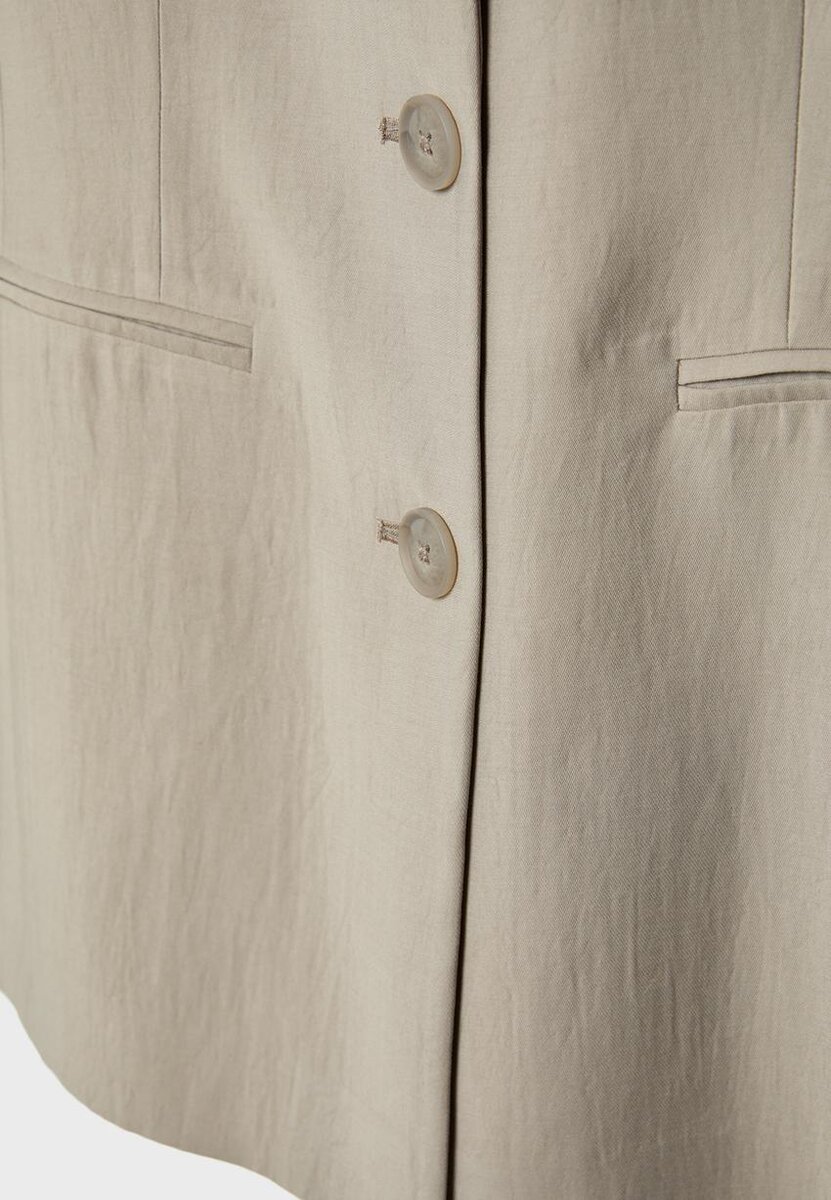 Tettsittende blazer laget av et viskoseblandingsstoff. Har en krage med hakk og lange ermer. Lommer med klaff foran og en paspolert lomme på brystet. Tre knapper foran.