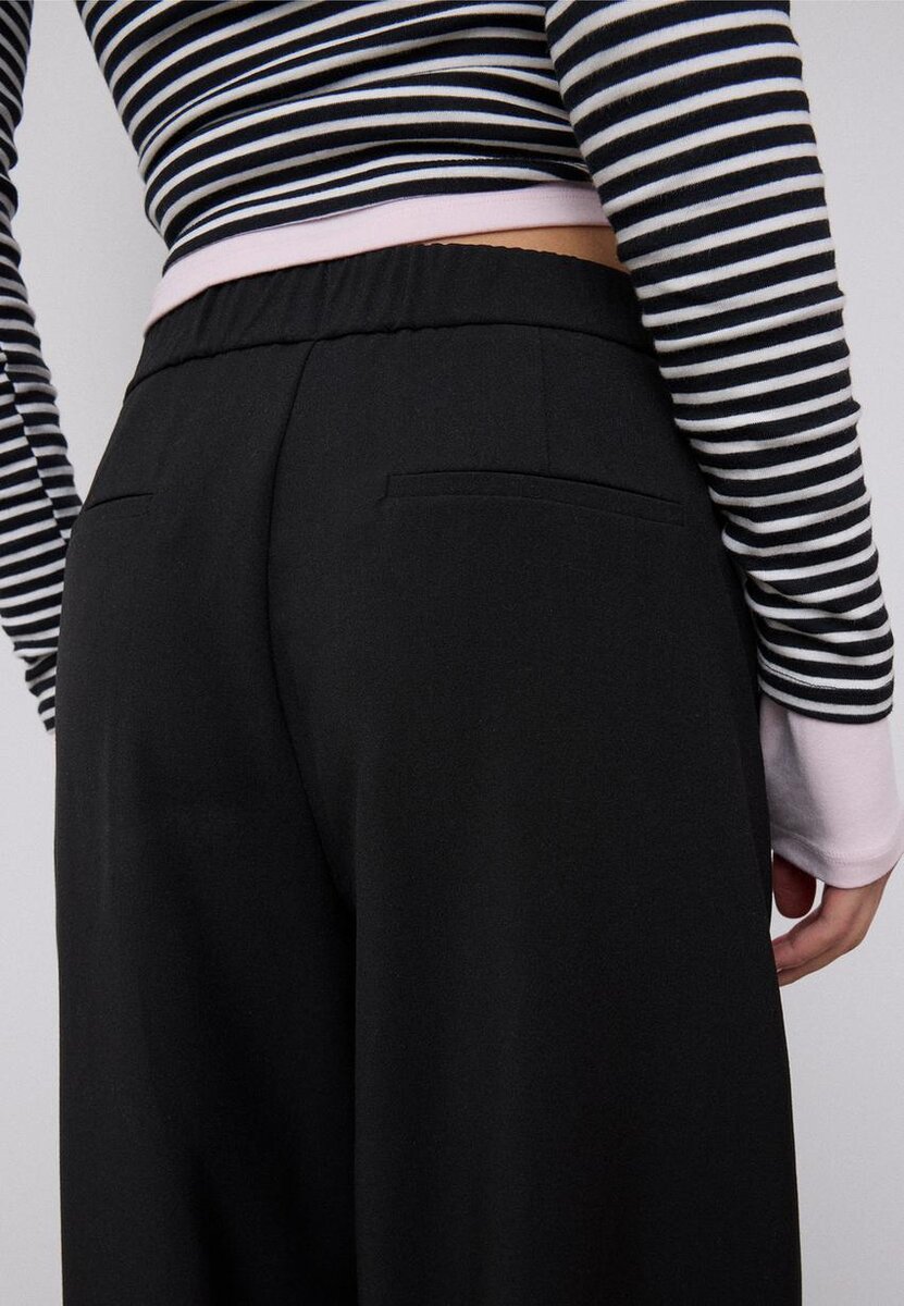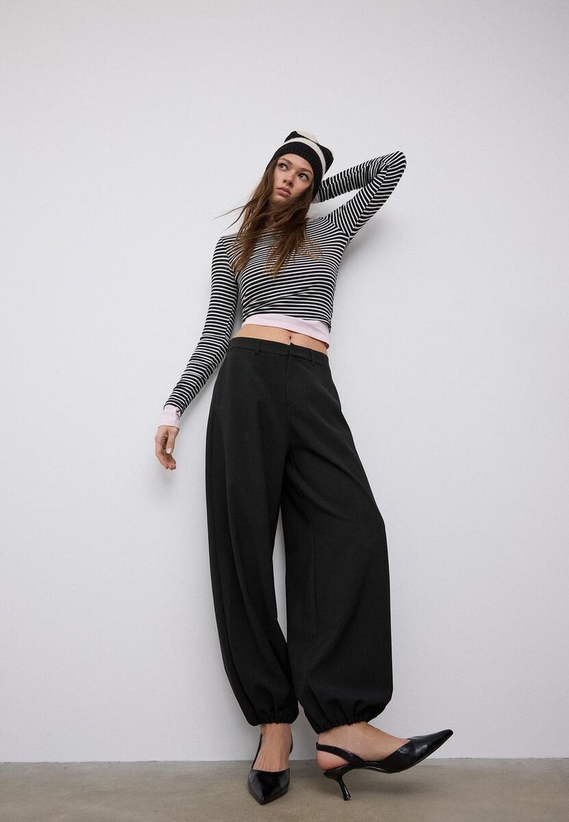 Ballongkjoler med middels høy midje. Elastisk midje med beltestropper. Sidelommer og falske paspolerte lommer bak. Plissedetaljer foran. Elastiske kanter. Glidelås foran med en innvendig knapp og metallkrok.