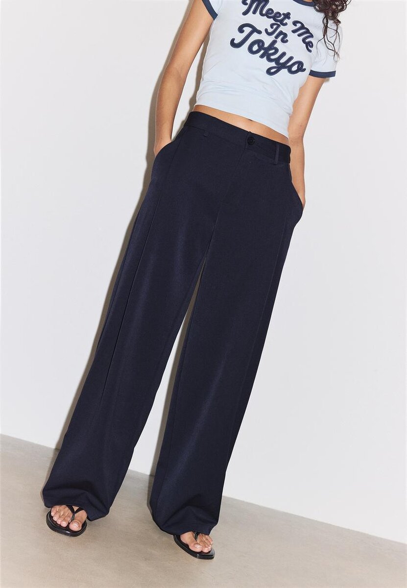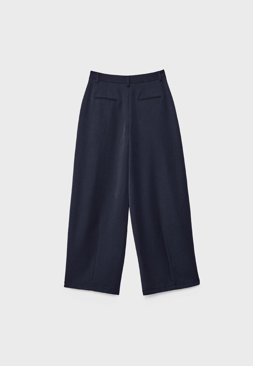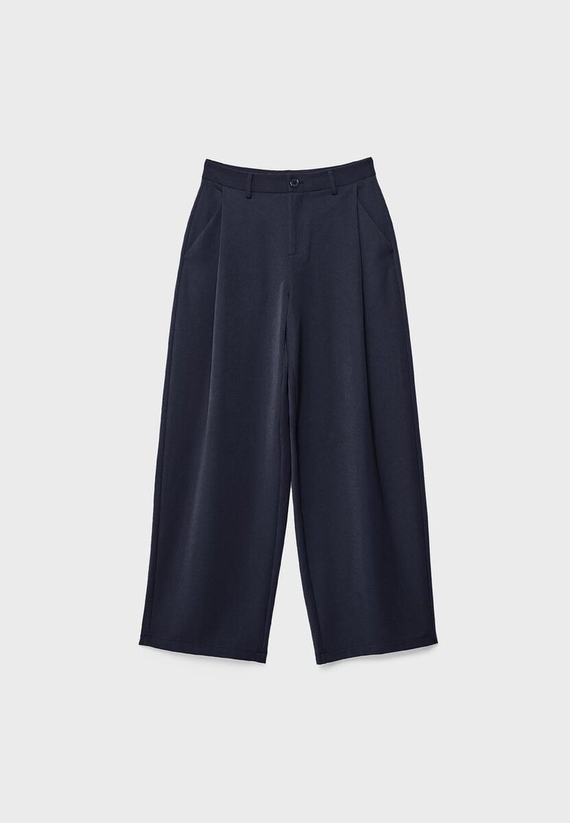 Barrel-bukser i middels høy midje og med beltehemper. Med sidelommer og falske baklommer. Innsnitt foran. Bredt, rett ben. Glidelås og knappestenging foran. Finnes i flere farger.