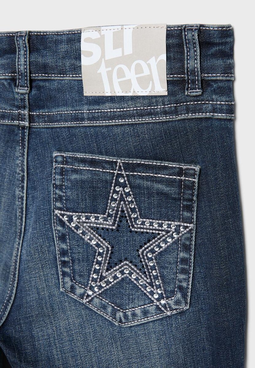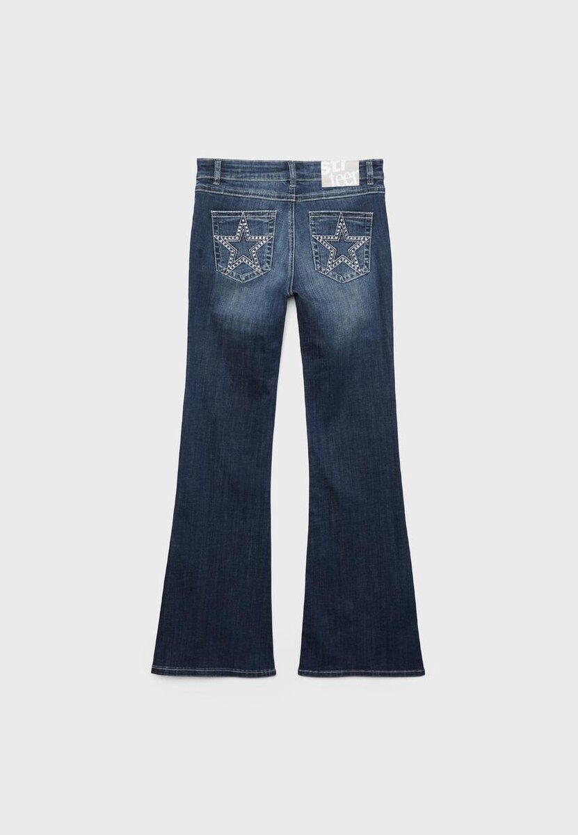 Jeans med lav midje og klokkeformet bukseben, med beltestropper. Har lommer foran og påsydde lommer med klaff og knapp bak. Flared kant. Glidelås foran og dobbel metallknapp-lukking. Broderte detaljer og rhinestones på baklommene.
