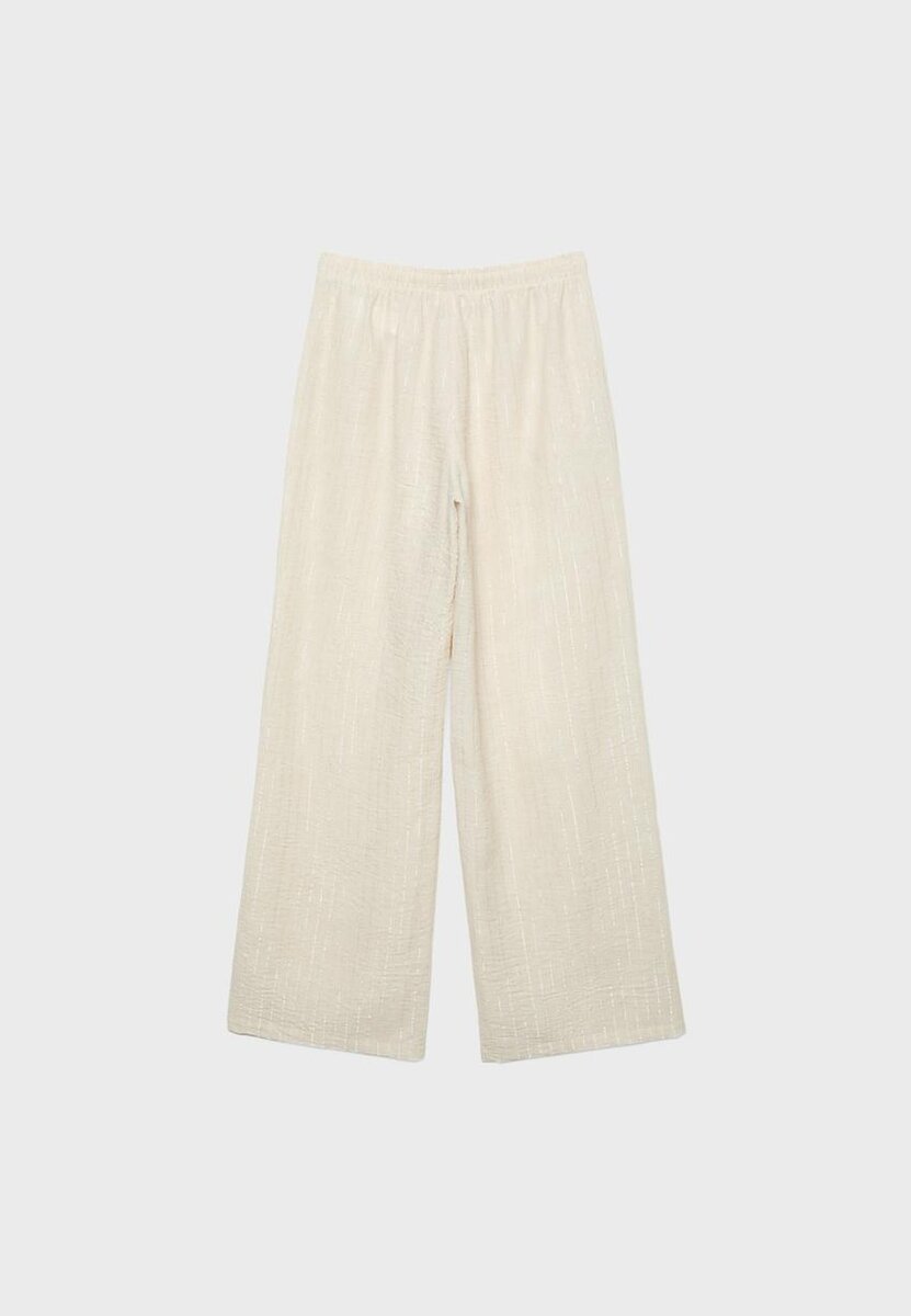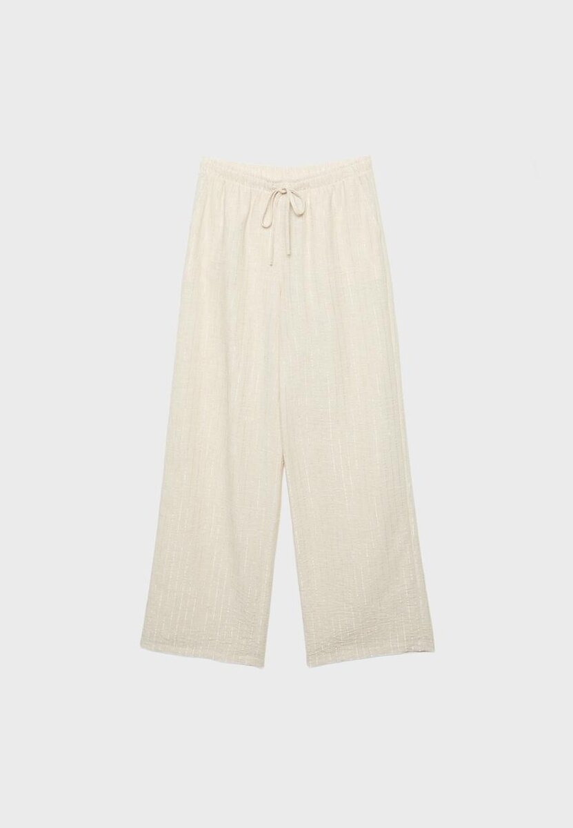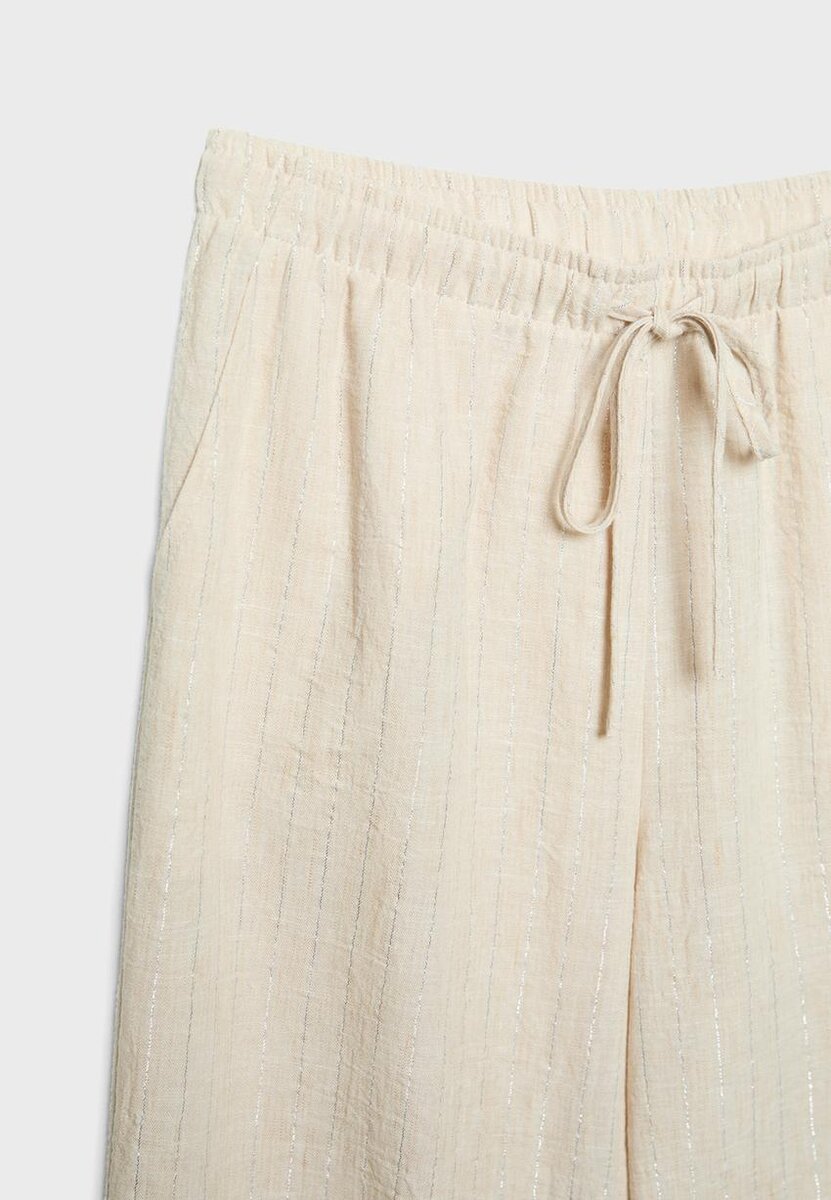 Bukser med høy midje laget av et stoff med lin-effekt og detaljer i metalltråd. Med bredt, rett ben, justerbar elastisk linning med matchende snøring og sidelommer. Tilgjengelig i ulike farger.
