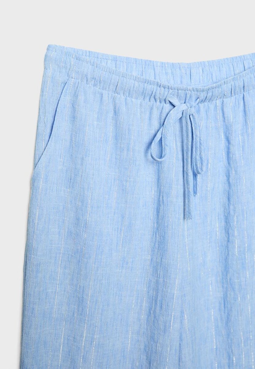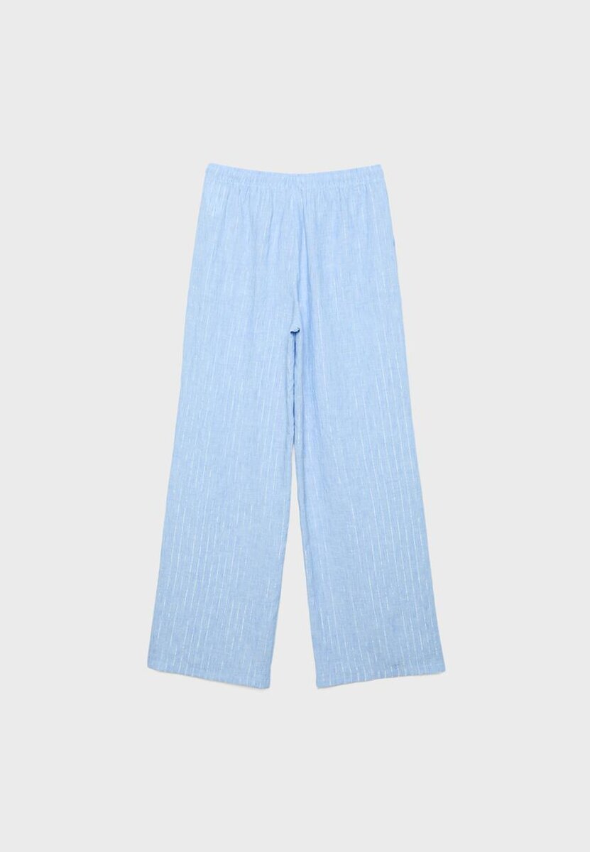 Bukser med høy midje laget av et stoff med lin-effekt og detaljer i metalltråd. Med bredt, rett ben, elastisk linning med justerbar snøring i samme stoff og sidelommer. Tilgjengelig i ulike farger.