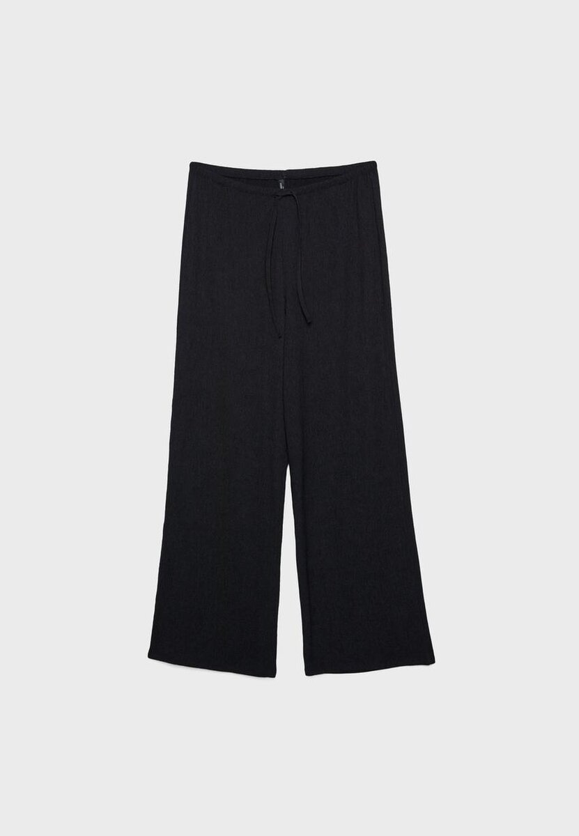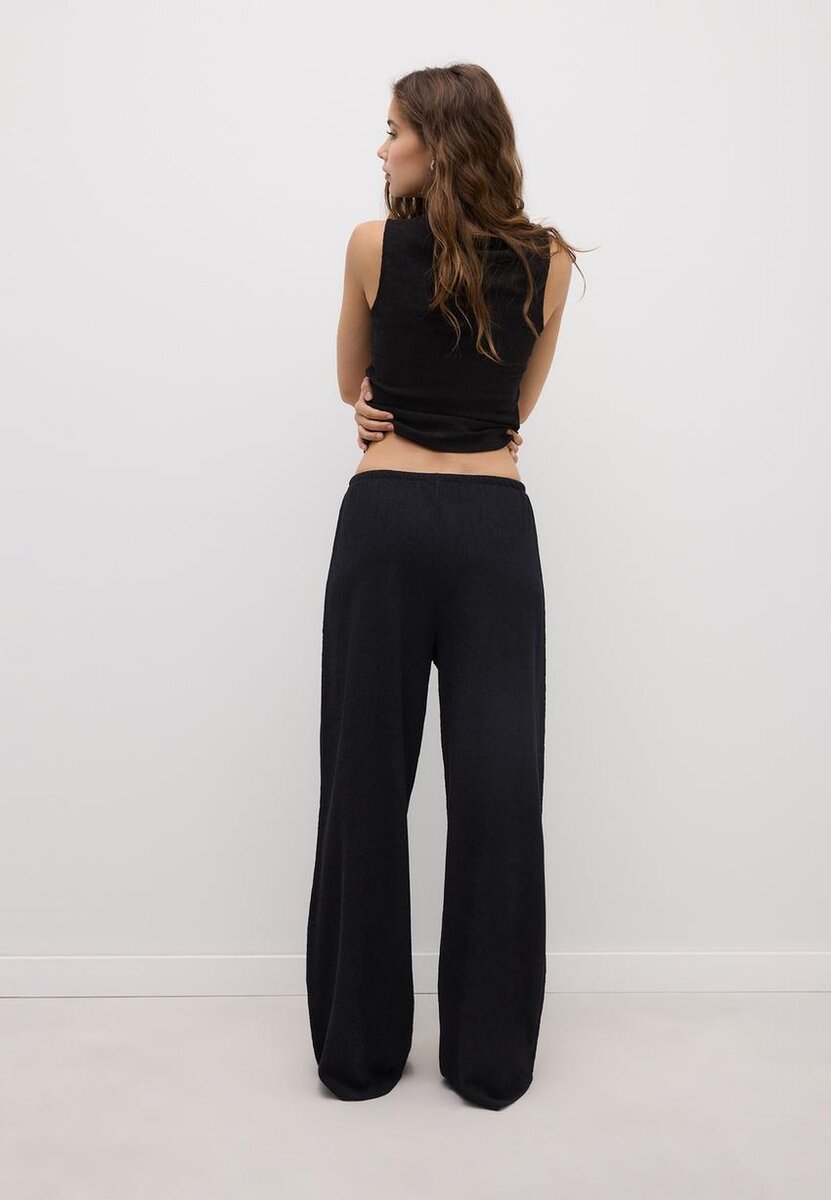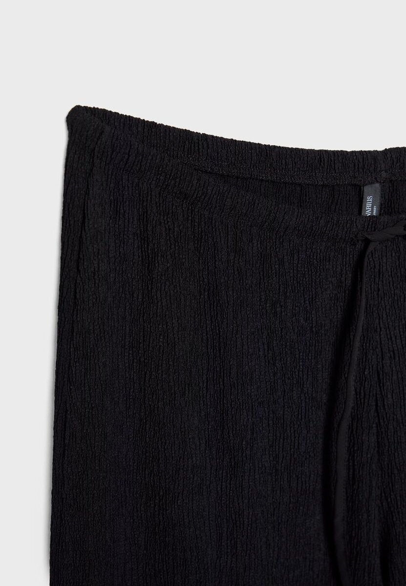 Lange bukser laget av elastisk stoff med krøllet tekstur. Med middels høy midje og justerbar elastisk linning med snøring og bånd. Rett ben med et flytende fall. Tilgjengelig i ulike farger.
