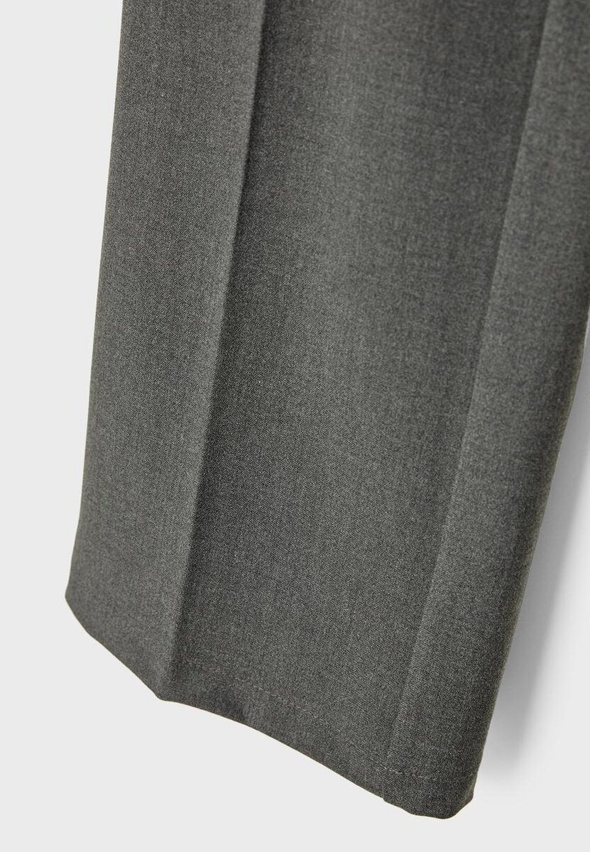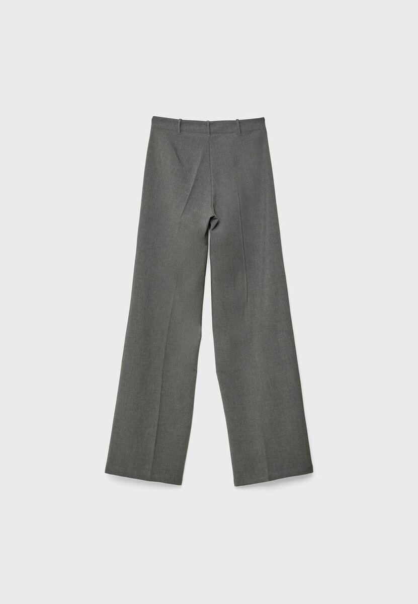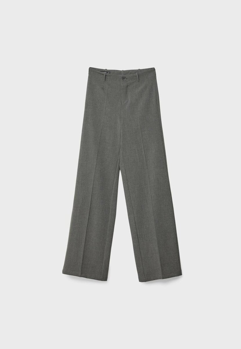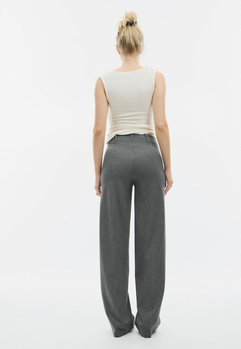 Bukser med midjehøyde og beltestropper. Med vid, rett ben. Glidelås og knappestenging foran. Tilgjengelig i flere farger.