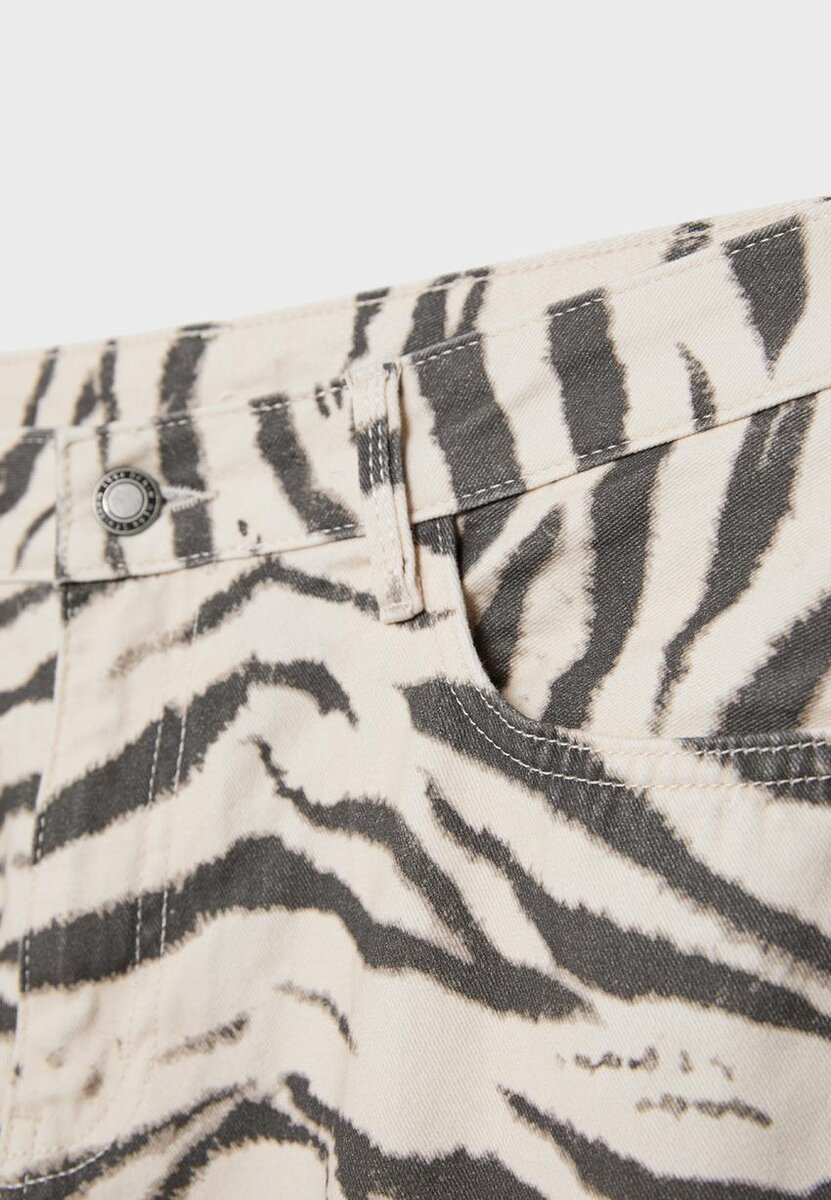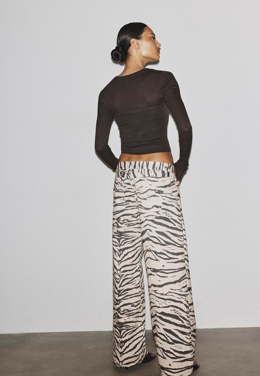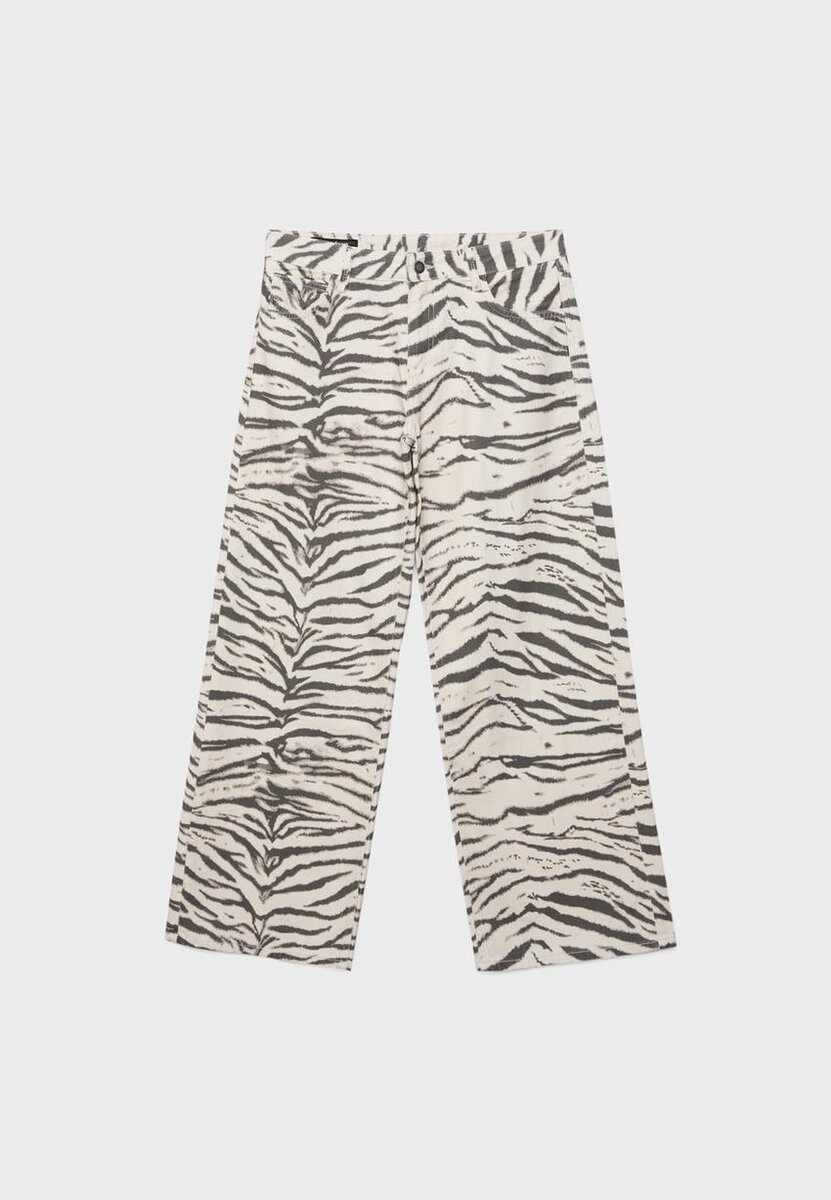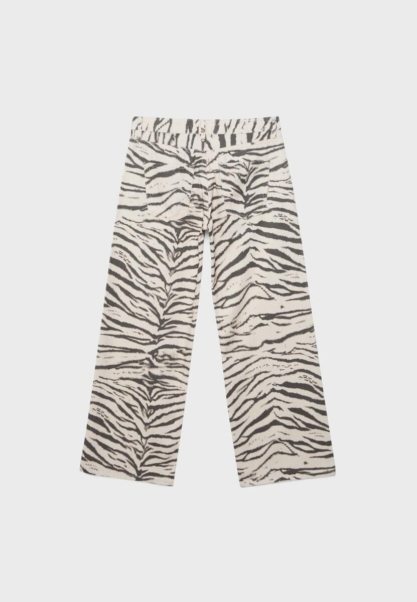 Bukser med vidt ben, fem lommer og beltestropper i livet. Glidelås og knappelukking foran. Har detaljer i stoff med mønstret dyremønster.