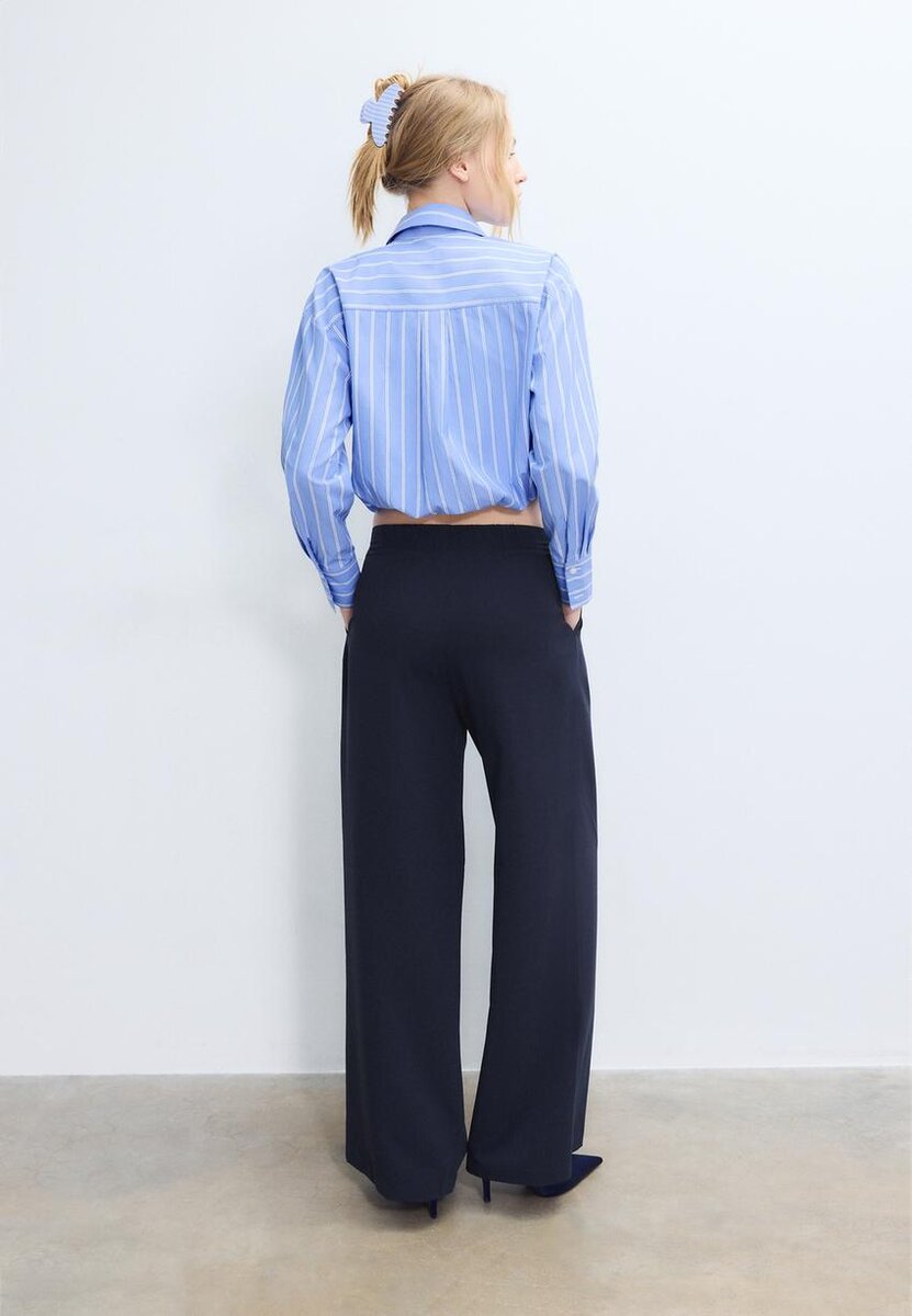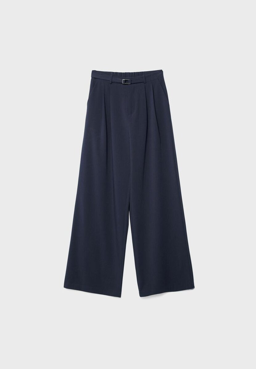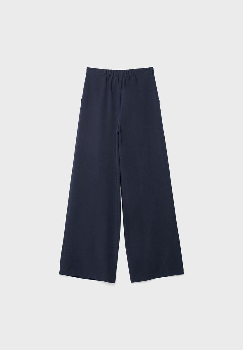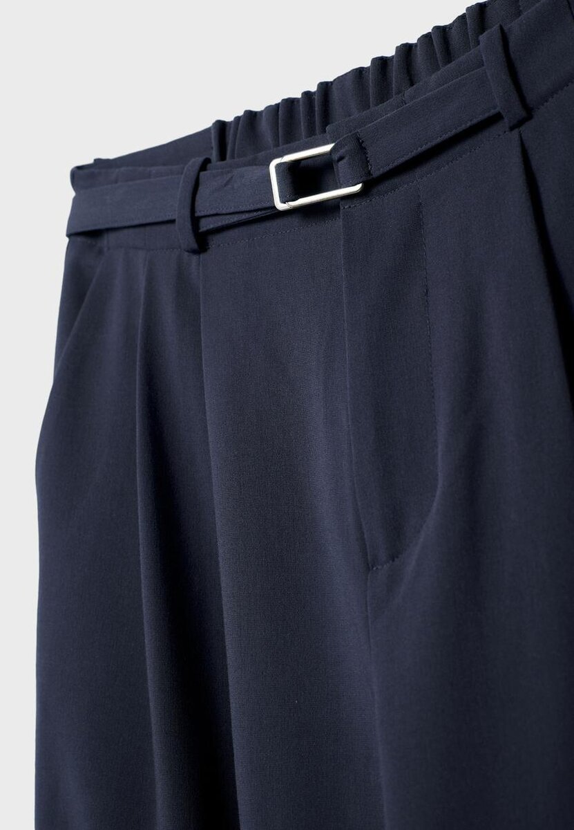 Velløpende bukser med høy midje og sidelommer. Elastisk linning bak med justerbare stropper og metallspenner foran. Rett, Wide Leg med innsnit foran. Glidelås, knapp på innsiden og metallkrok foran. Tilgjengelig i flere farger.
