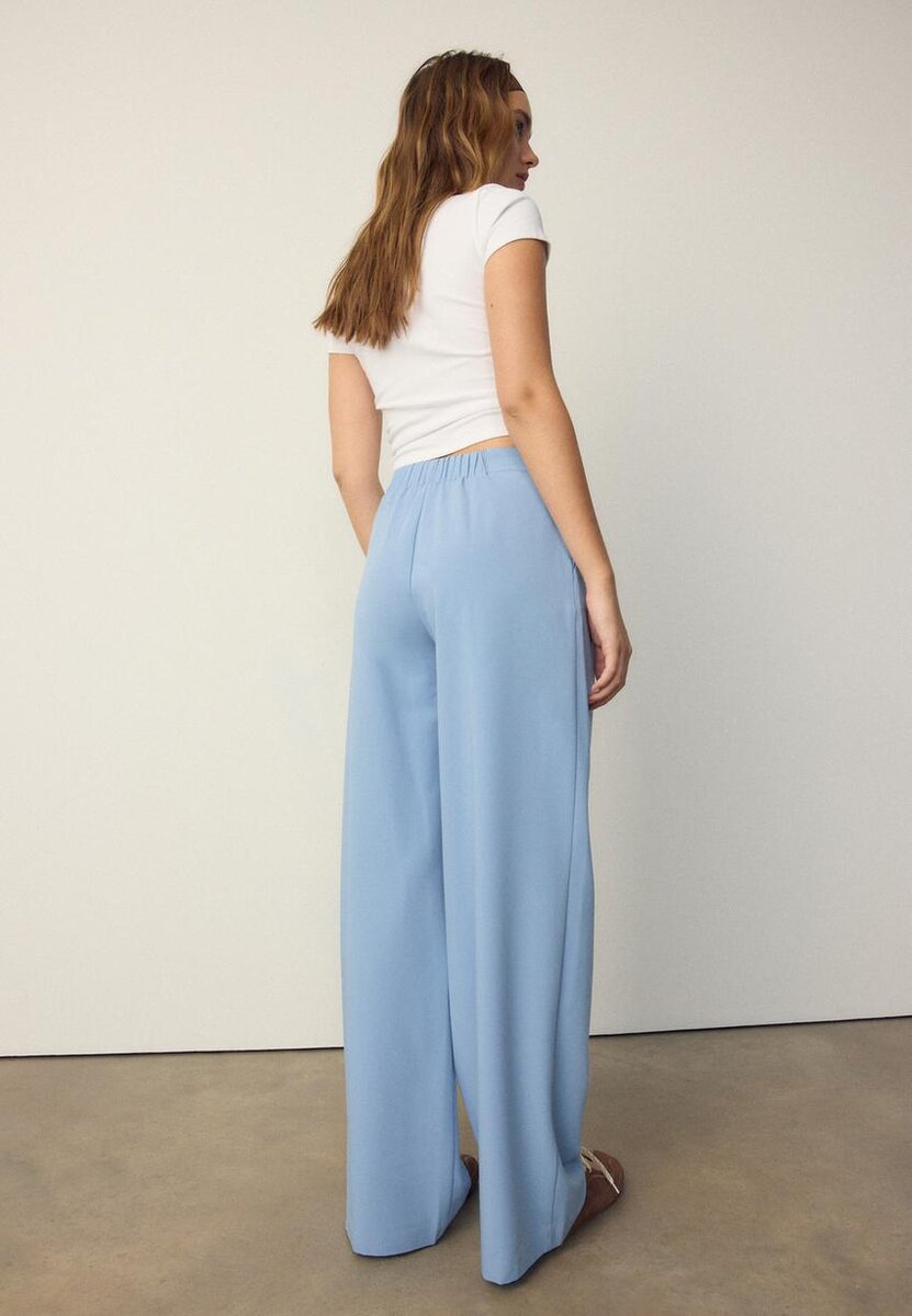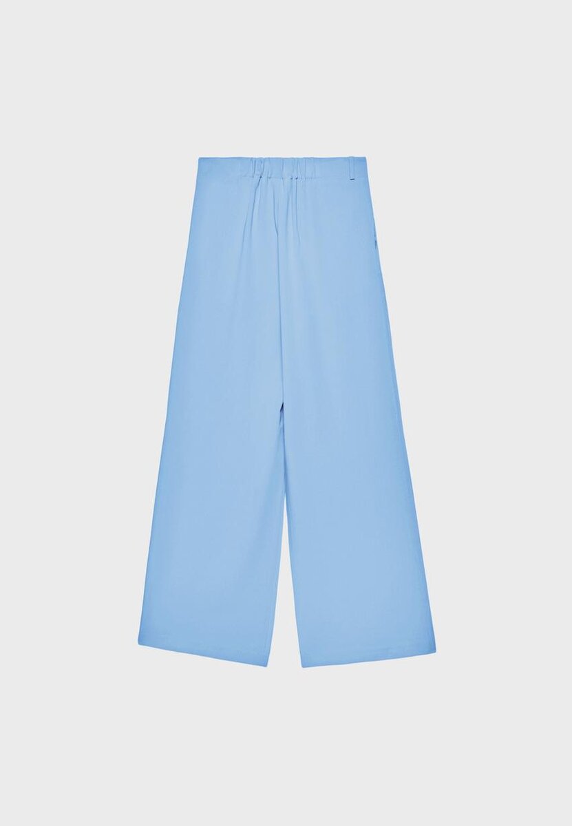 Velløpende bukser med høy midje og sidelommer. Elastisk linning bak med justerbare stropper og metallspenner foran. Rett, Wide Leg med innsnit foran. Glidelås, knapp på innsiden og metallkrok foran. Tilgjengelig i flere farger.