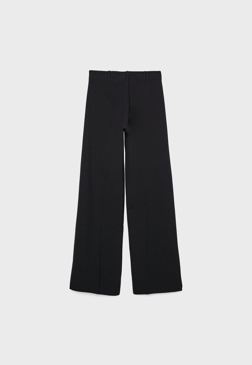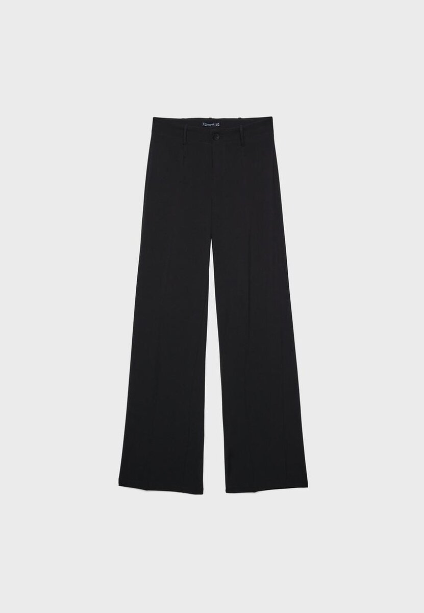 Bukser med midjehøyde og beltestropper. Med vid, rett ben. Glidelås og knappestenging foran. Tilgjengelig i flere farger.