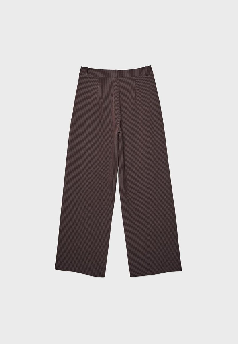 Bukser med middels høy midje og beltestropper. Sidelommer. Innstikk foran. Rett, Wide Leg-modell. Krysset lukking foran med glidelås og knapp på innsiden.