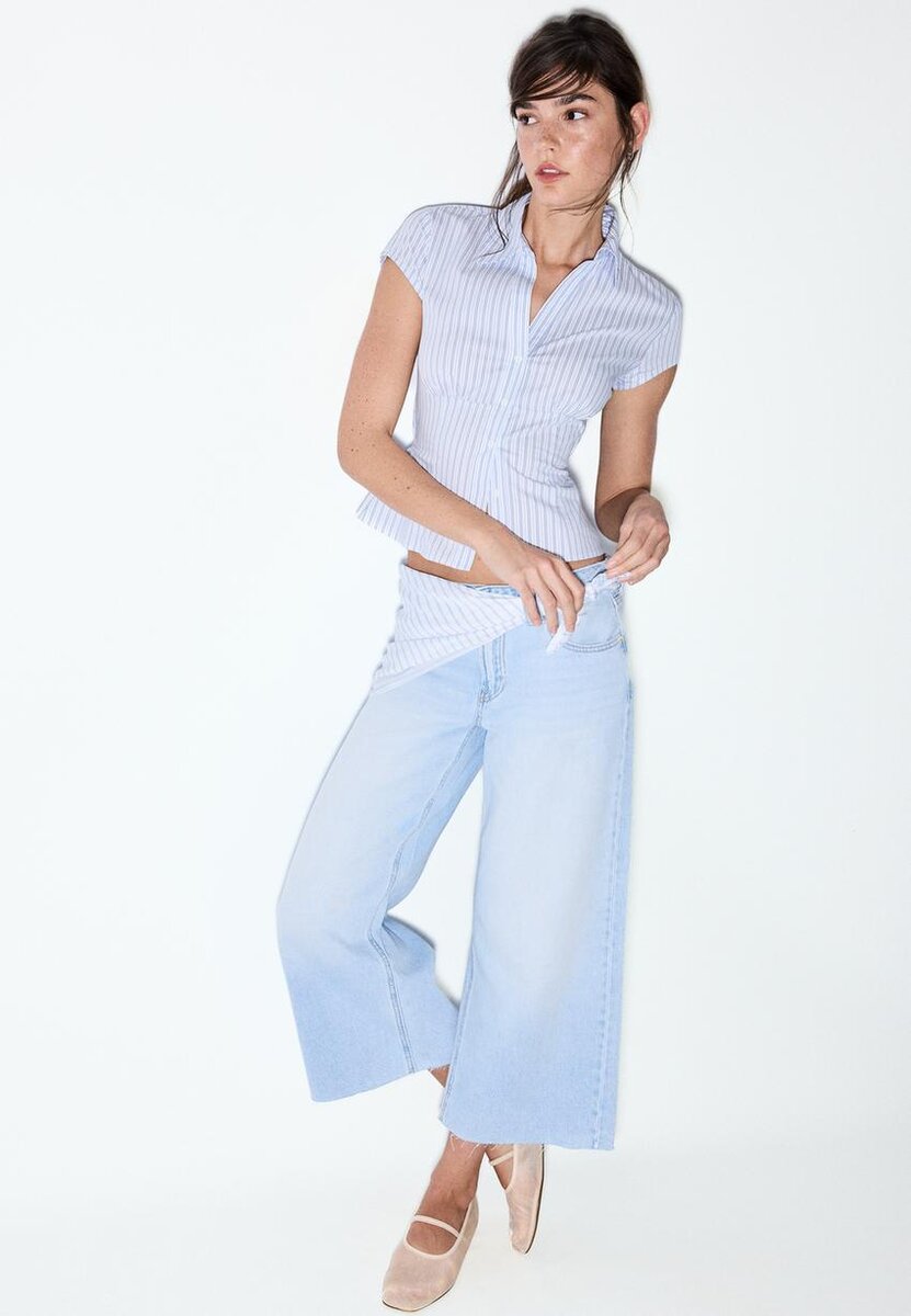 Culotte-jeans med høy midje, belteløkker og detaljer i stripete stoff med knuter. Lommer foran. Vid ben med flosset kant. Glidelås foran og metallknapp. Laget av bomull.