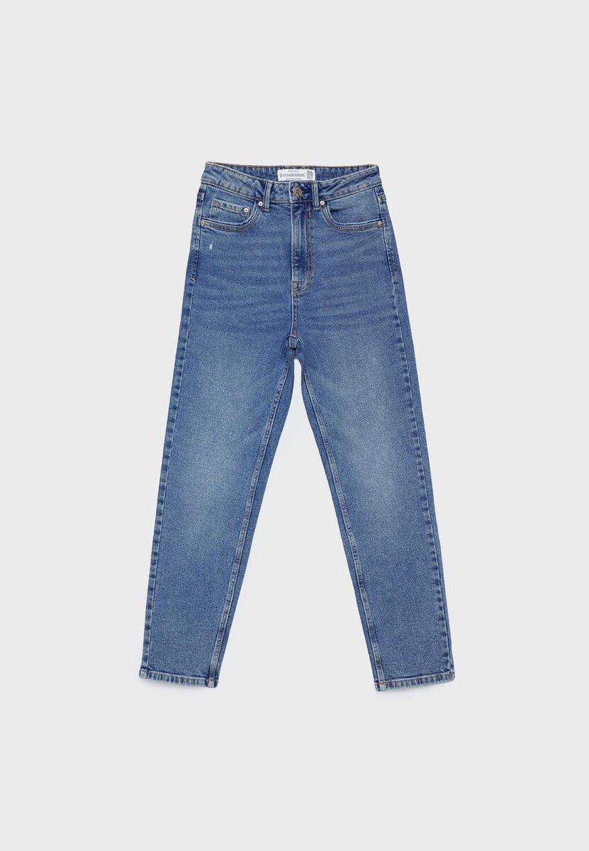 Slim Fit Mom Jeans med superhøy midje og fem lommer. Glidelås og metallknapp øverst.