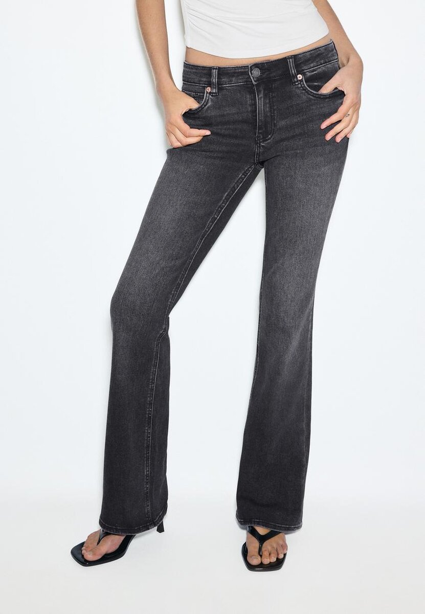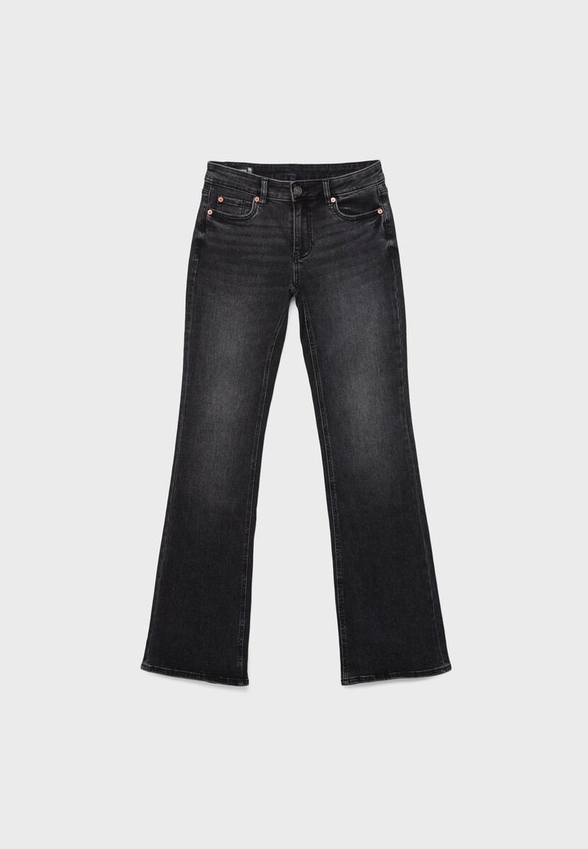 Jeans med lav midje og beltestropper. Lommer foran og påsydde lommer bak. Tettsittende ben til kneet med lett Flared kant. Tilgjengelig i flere farger.