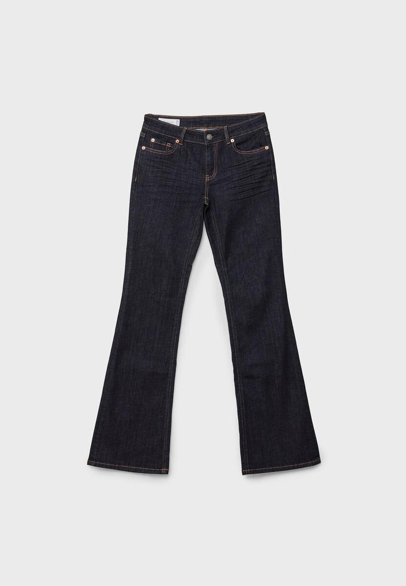 Jeans med lav midje og beltestropper. Lommer foran og påsydde lommer bak. Tettsittende ben ned til kneet og Flared nederst. Finnes i flere farger.