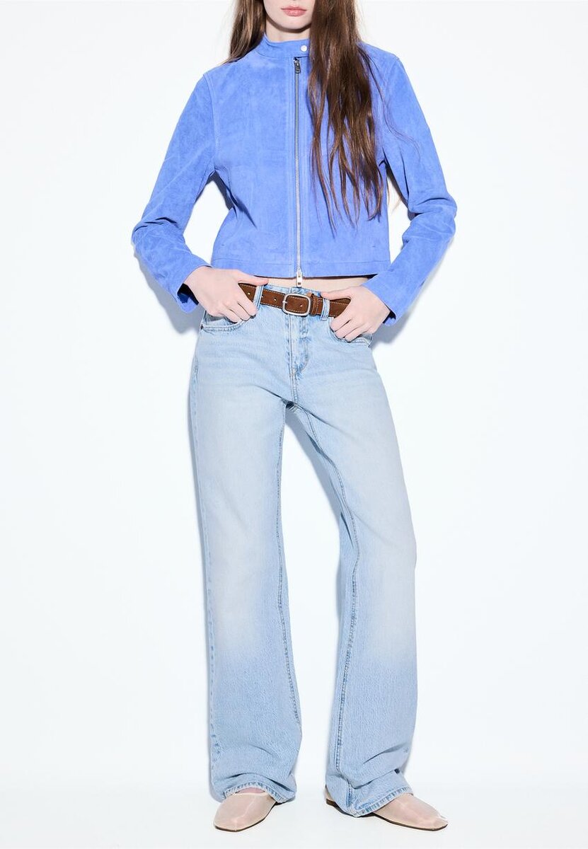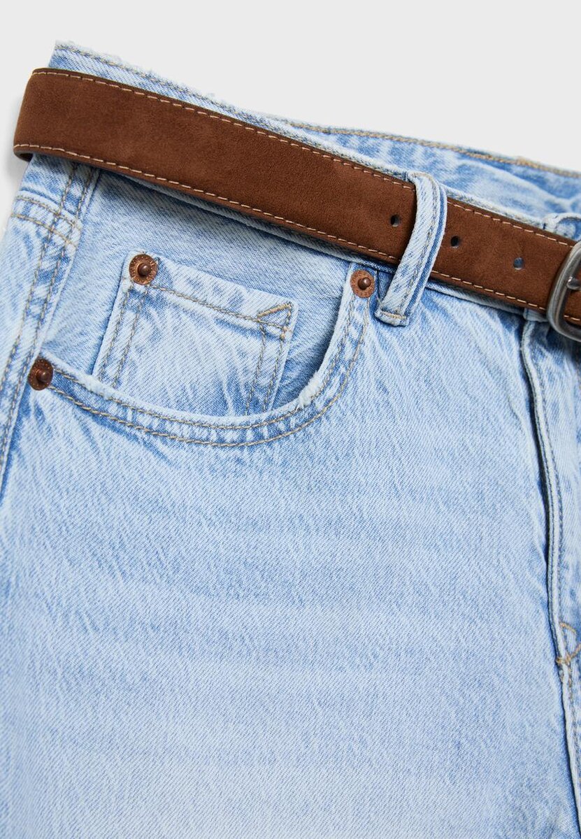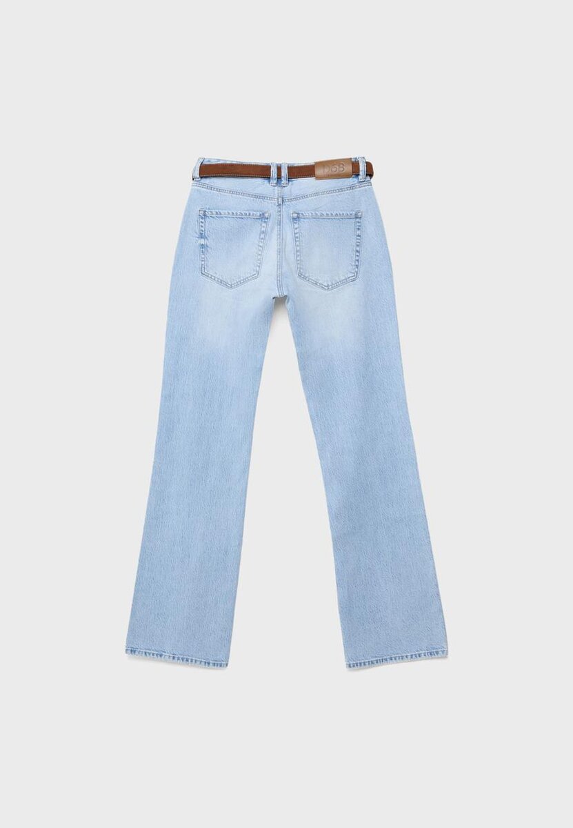 Jeans med midjehøyde og beltestropper. Med frontlommer, påsydde baklommer og et ton-i-ton avtakbart belte med metallspenne. Tettsittende til kneet med en lett flared utvidelse nederst. Tilgjengelig i ulike farger.