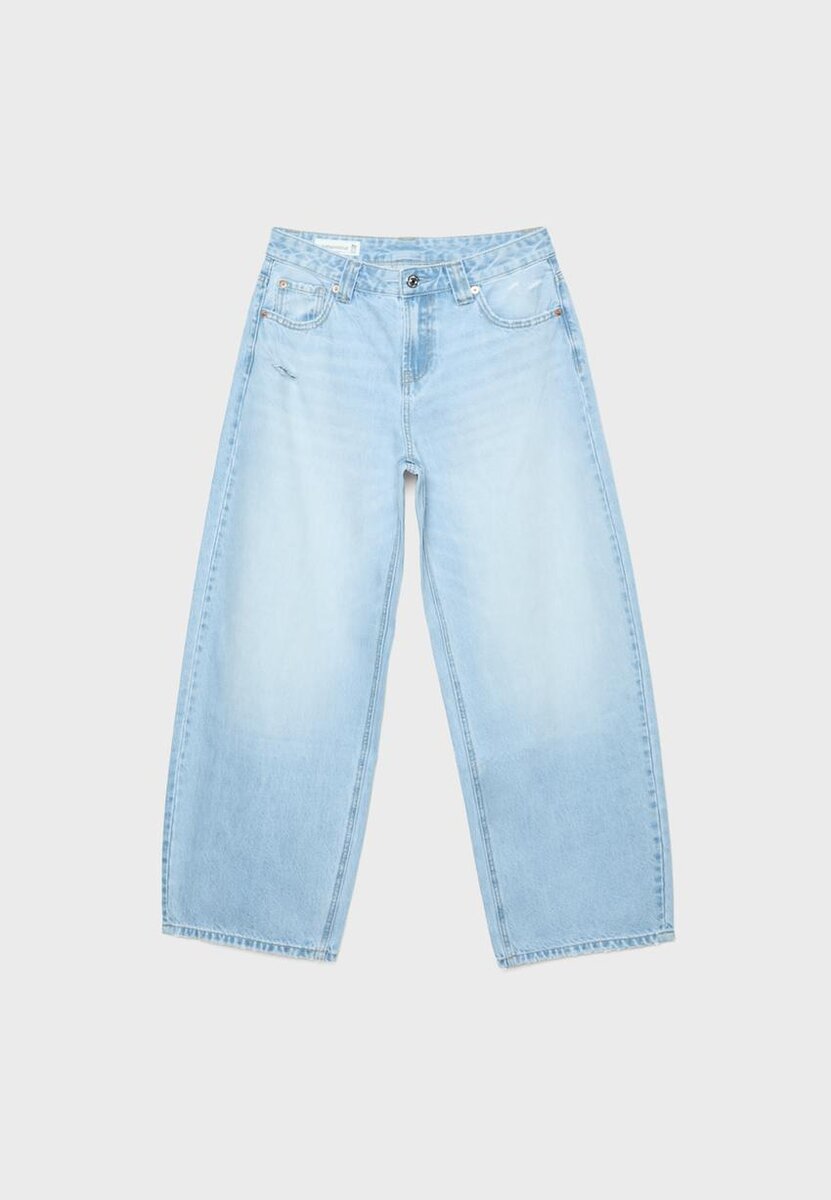 Barrel-jeans med høy midje, beltehemper og fem lommer. Glidelås og knappelukking foran. Tilgjengelig i ulike farger.