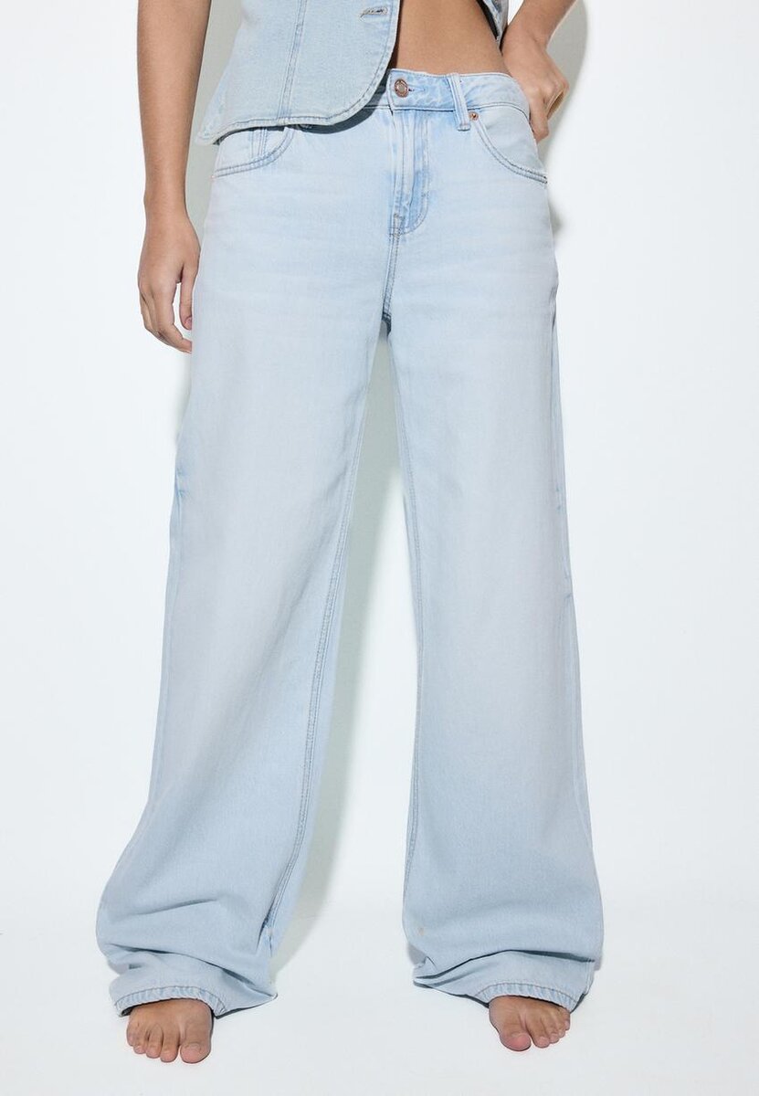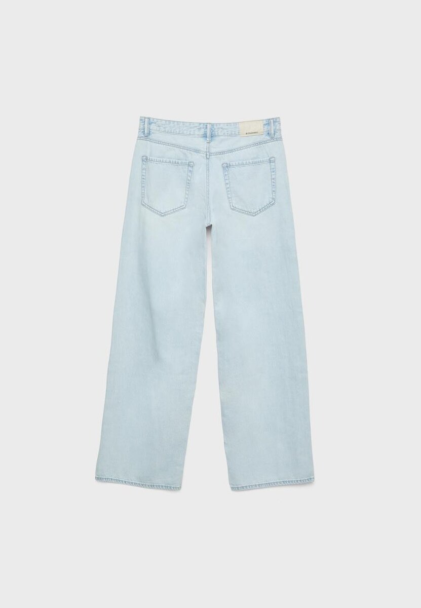 Jeans med lav midje og Wide Leg-ben, med beltestropper. Med lommer foran og påsydde lommer bak. Rett ben. Gylf med glidelås foran og metallknapp øverst.