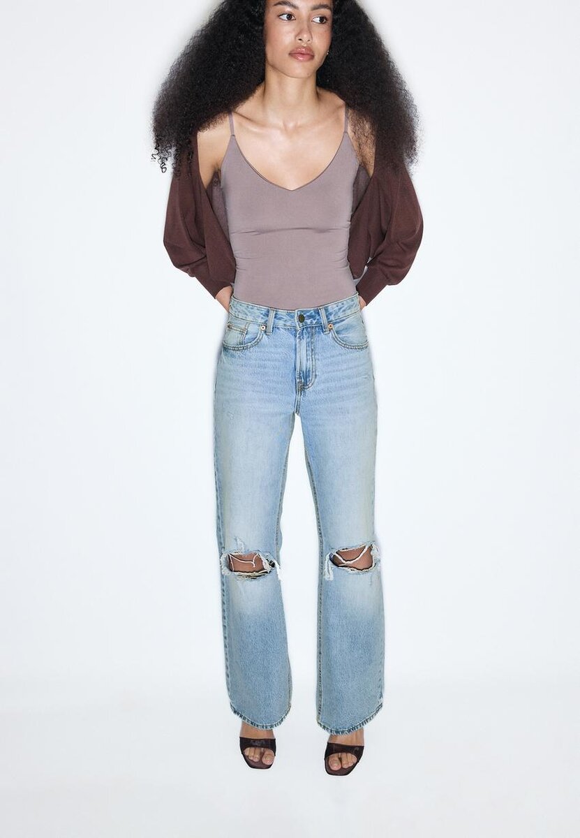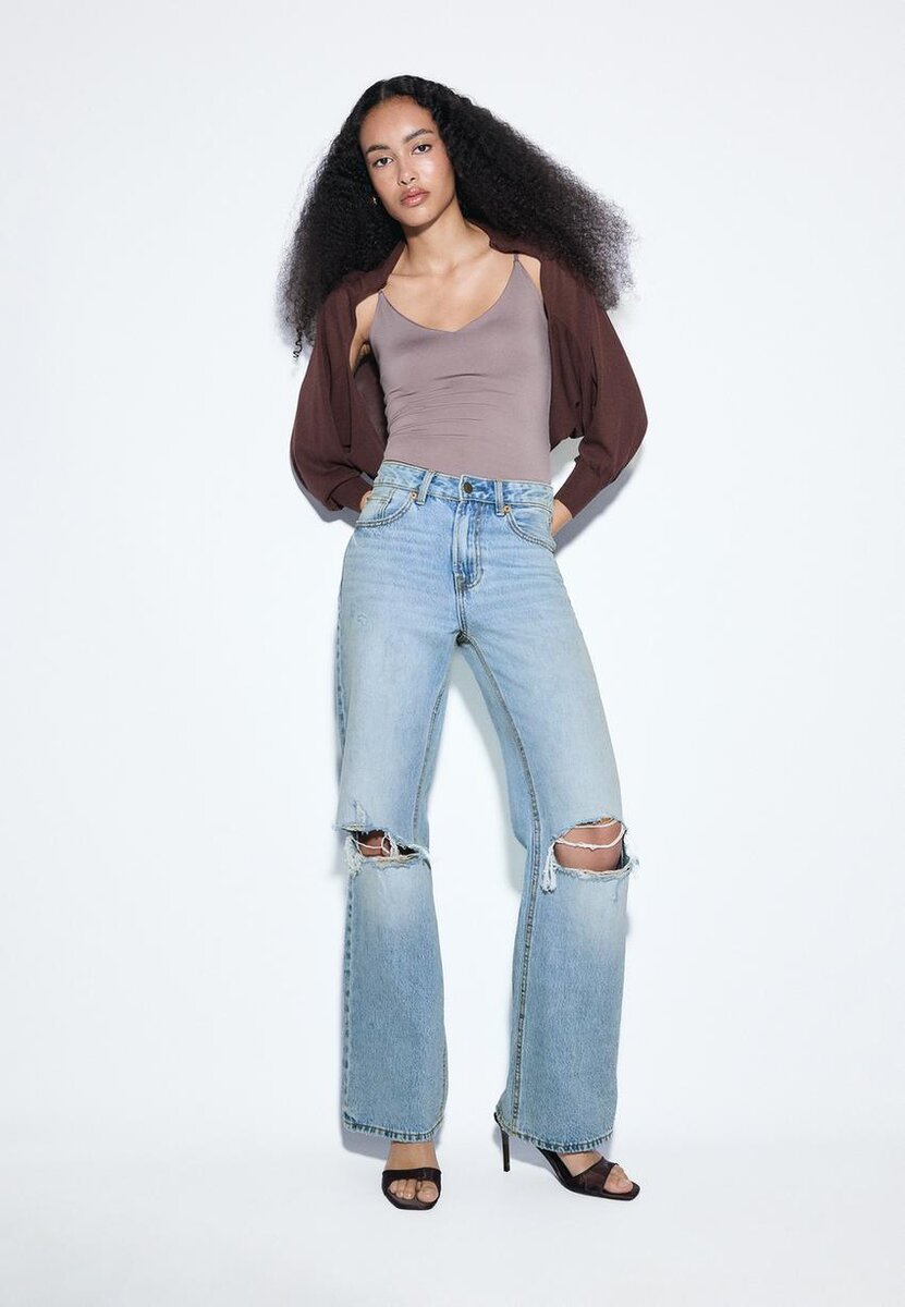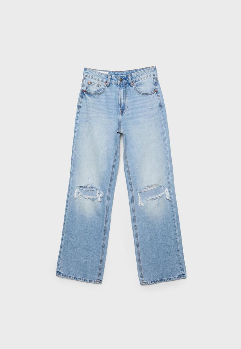 Jeans med høy midje, rett og Wide Leg passform og fem lommer. Glidelås og metallknapp øverst.