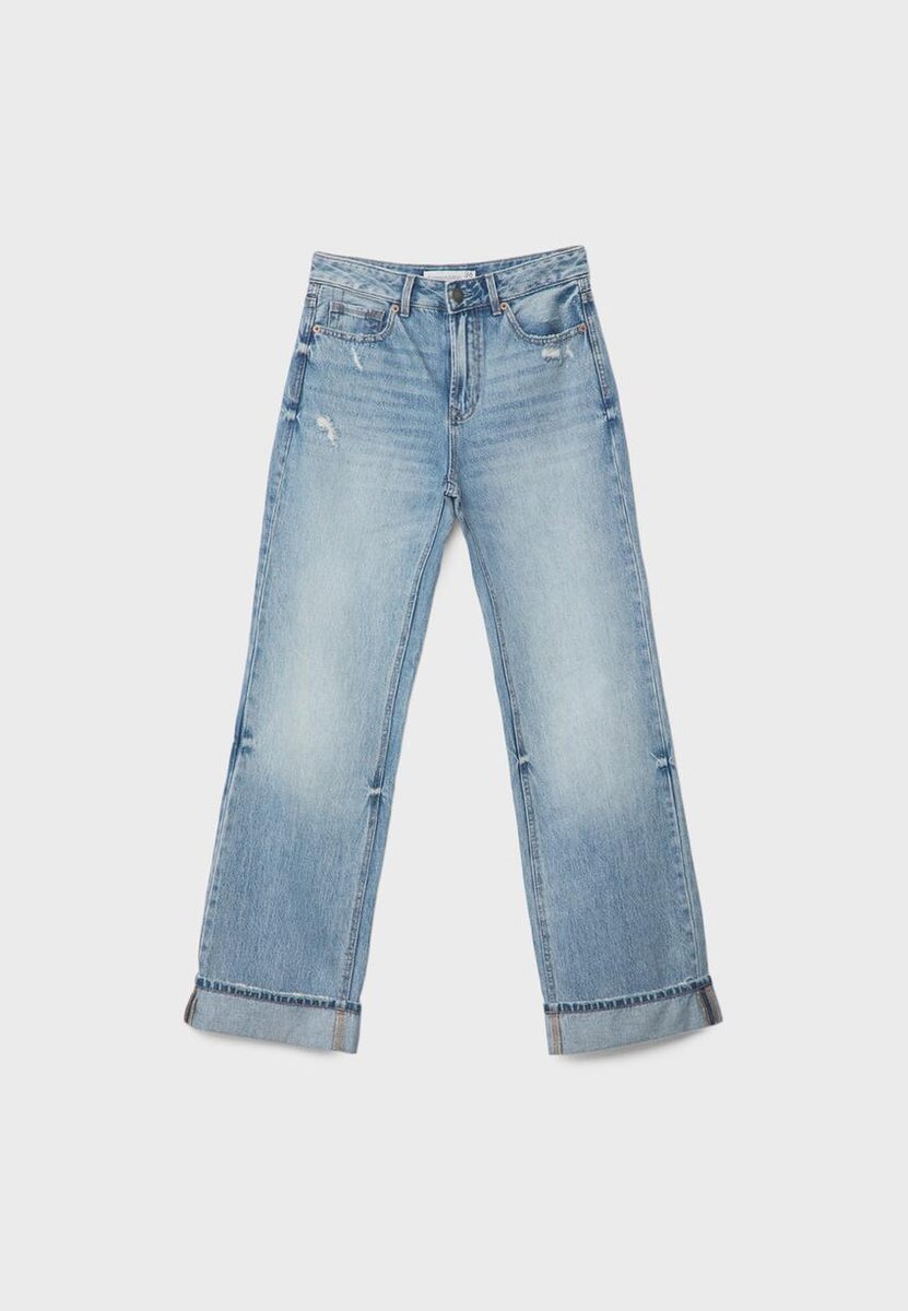Jeans med høy midje, rett og Wide Leg-vidde og fem lommer. Gylf med glidelås og metallknapp. Tilgjengelig i ulike farger.