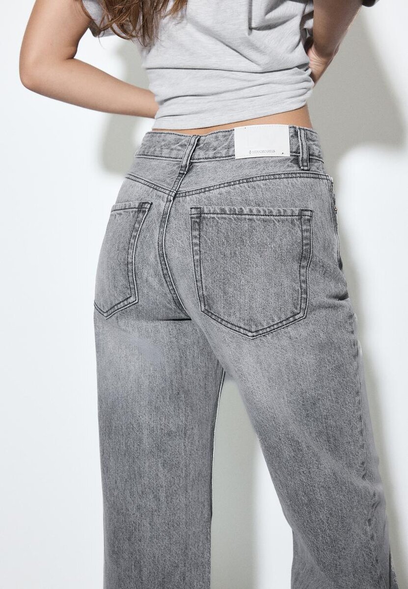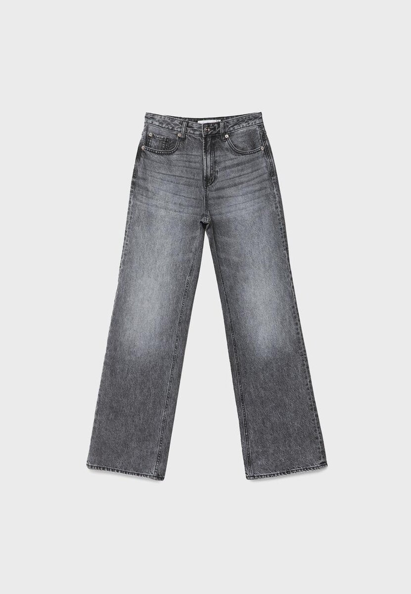 Jeans med høy midje, rett og Wide Leg-passform og fem lommer. Glidelås og metallknapp øverst.