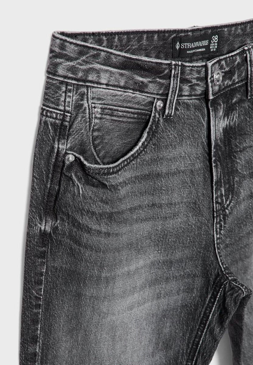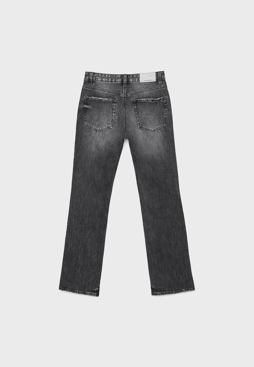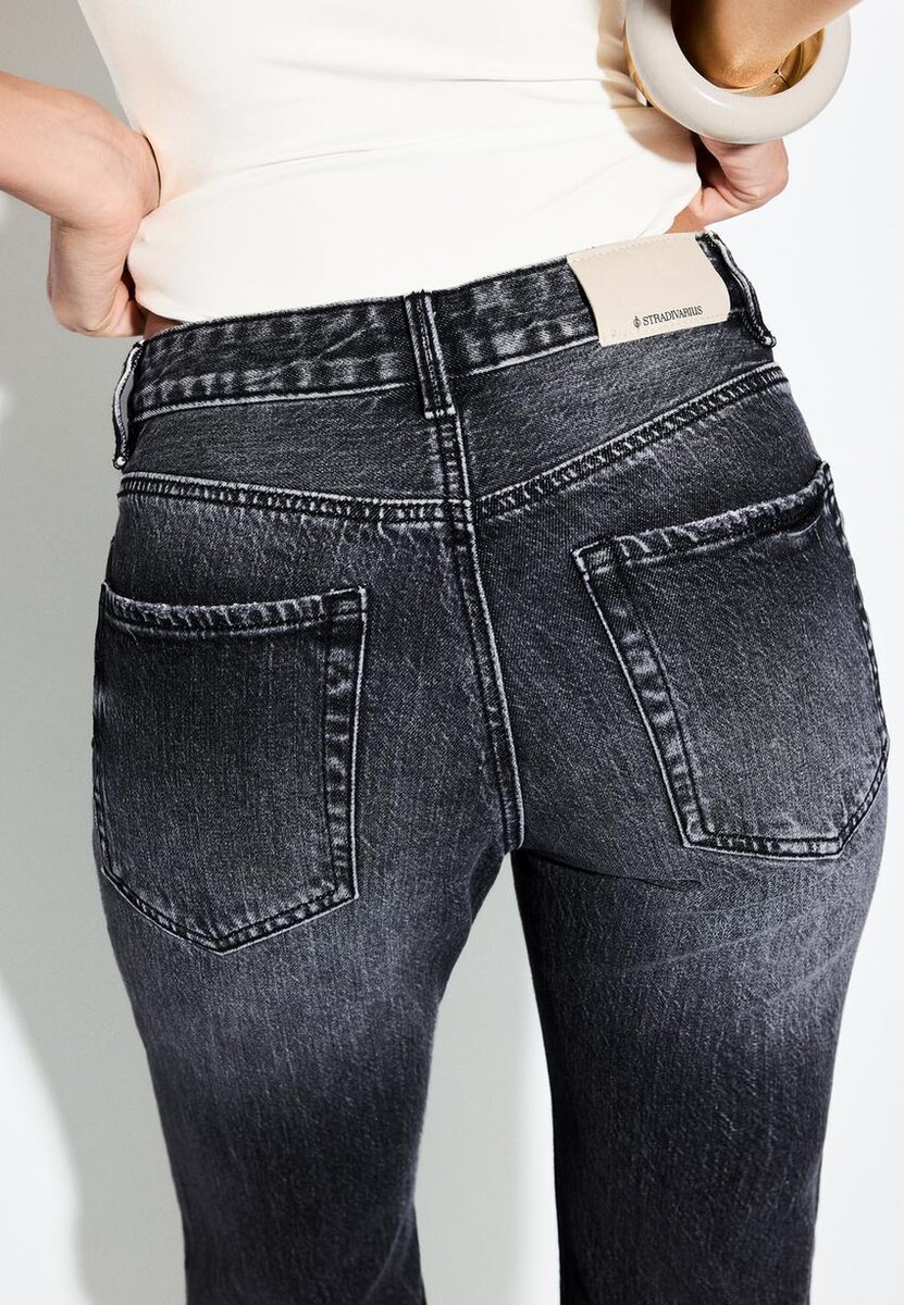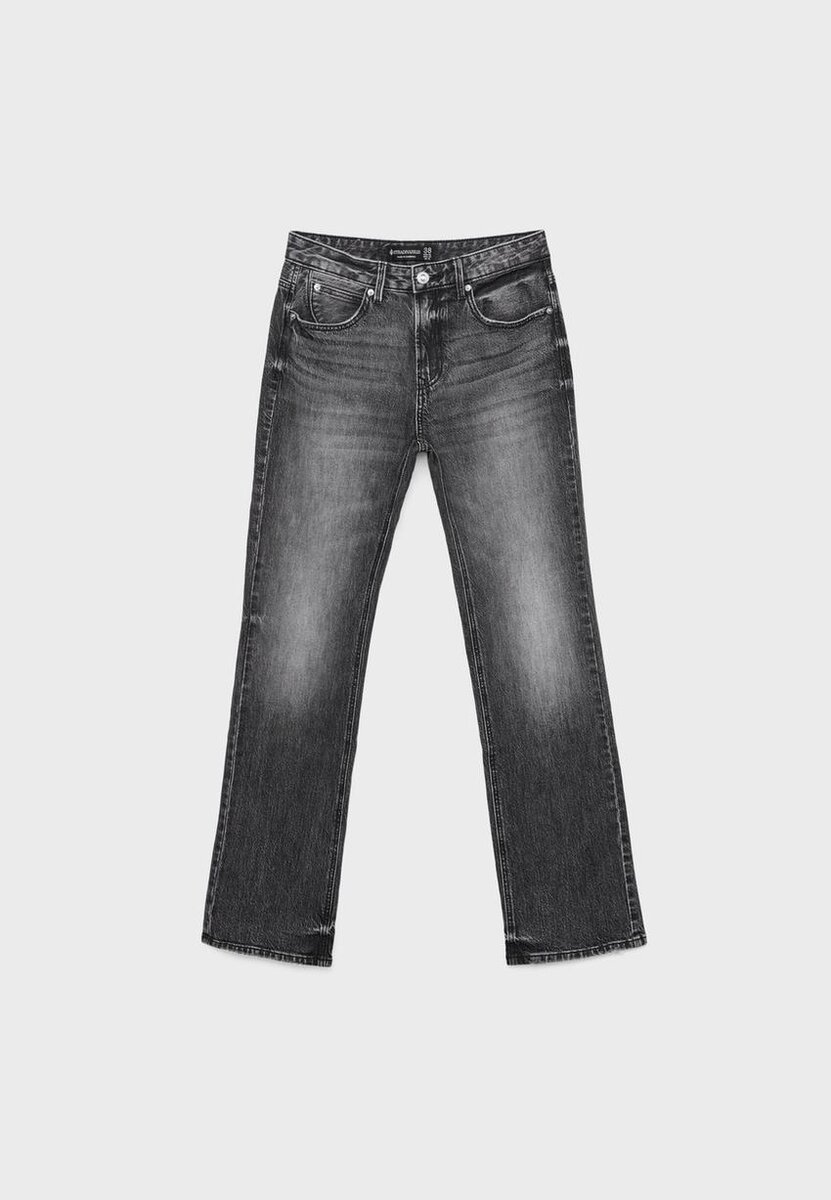 Jeans med rette ben, middels høy midje og fem lommer. Glidelås og metallknapper. Tilgjengelig i ulike farger. Midjehøyde: Vanlig midje til navlen