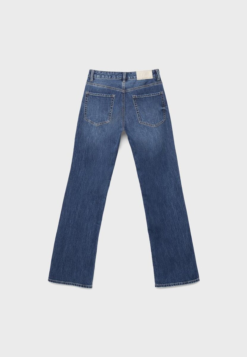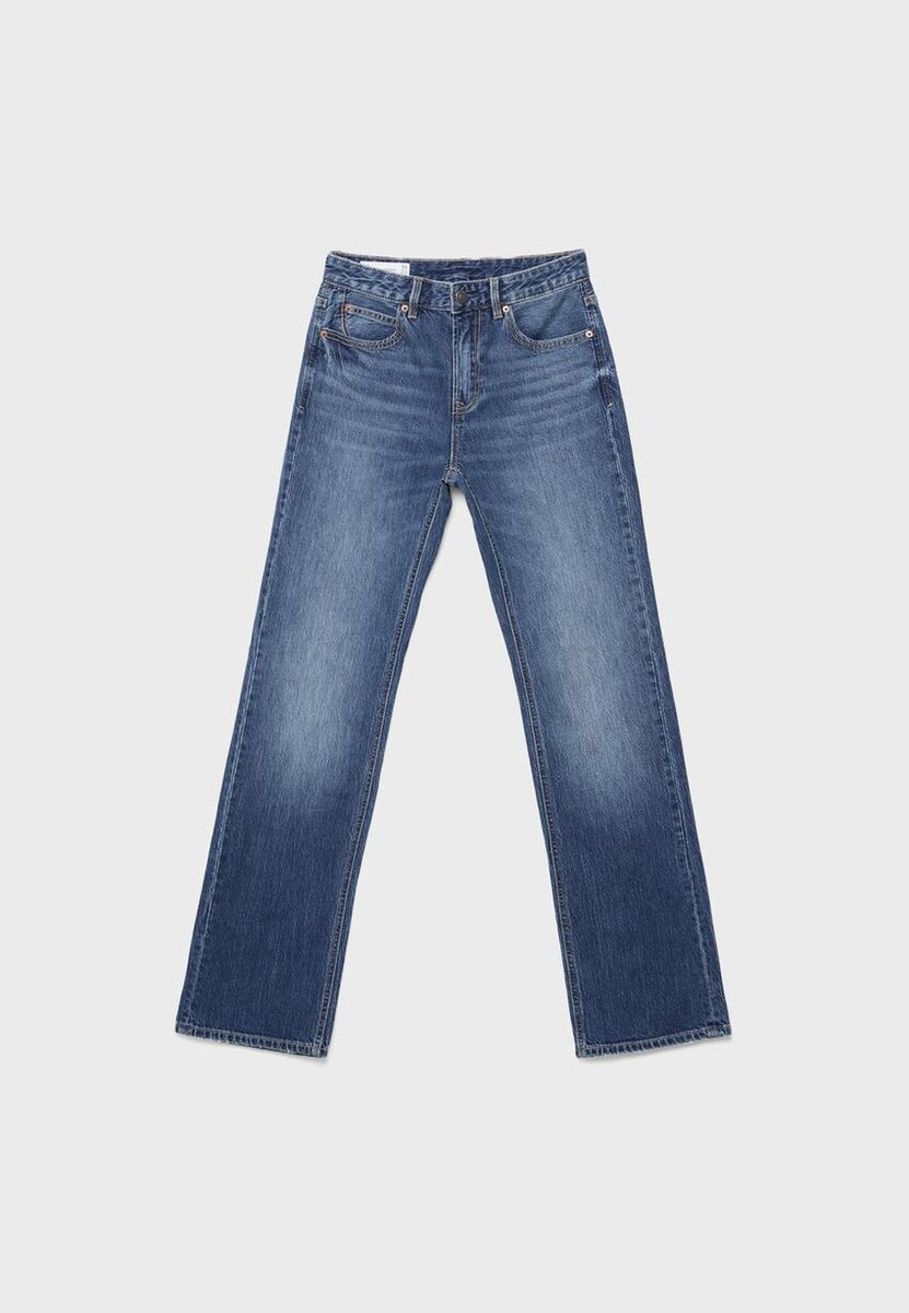 Jeans med rette ben og midjehøyde, med fem lommer. Glidelås foran og metallknapper. Tilgjengelig i flere farger.