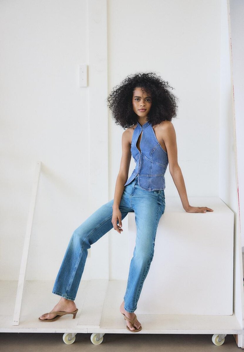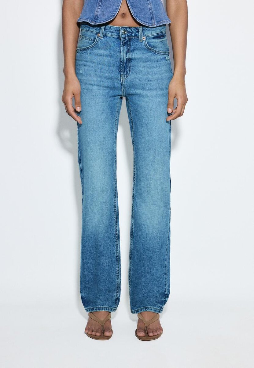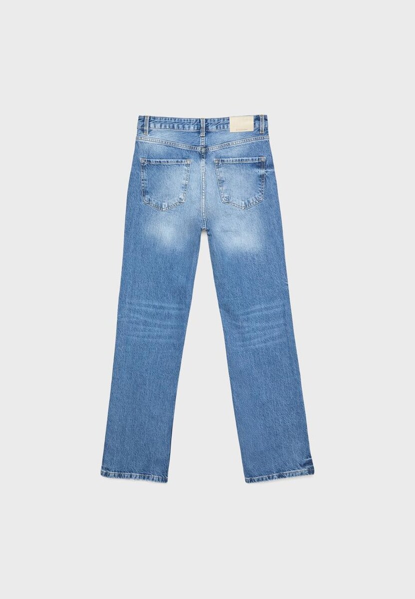 Jeans med rett ben, middels høy midje og fem lommer. Glidelås og metallknapper. Tilgjengelig i ulike farger.