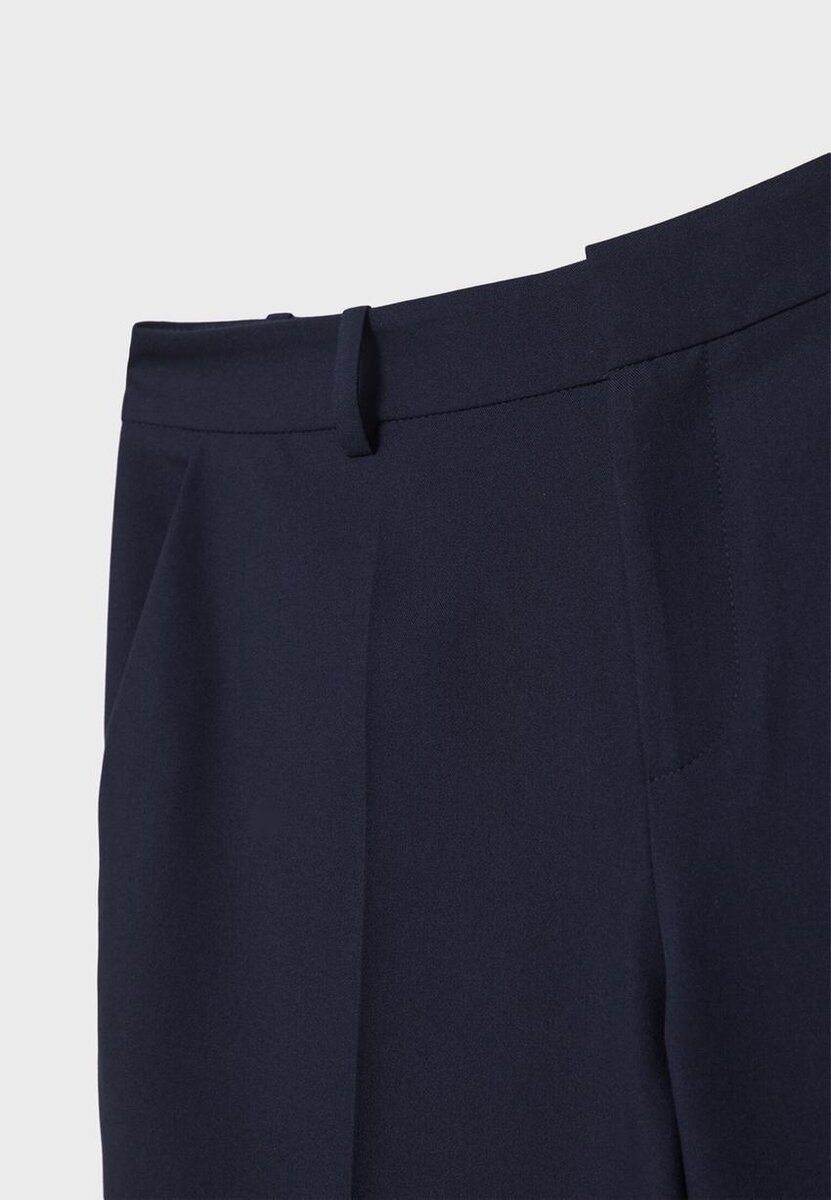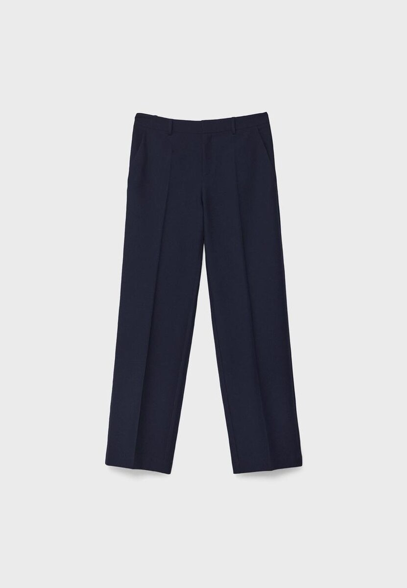 Bukser med middels høy midje og sidelommer. Beltehemper. Lommer med falske klaffer bak. Rett ben. Glidelås foran, knapp og metallkrok på innsiden. Tilgjengelig i ulike farger.