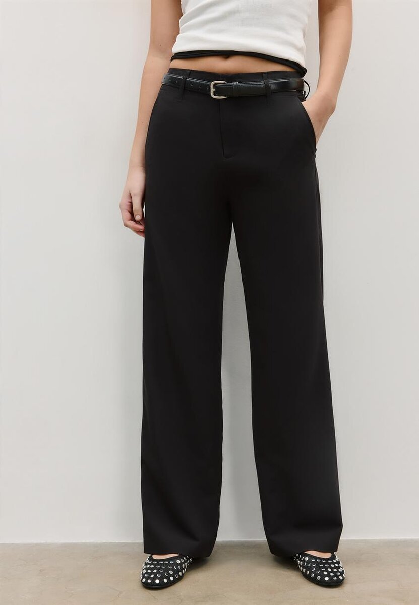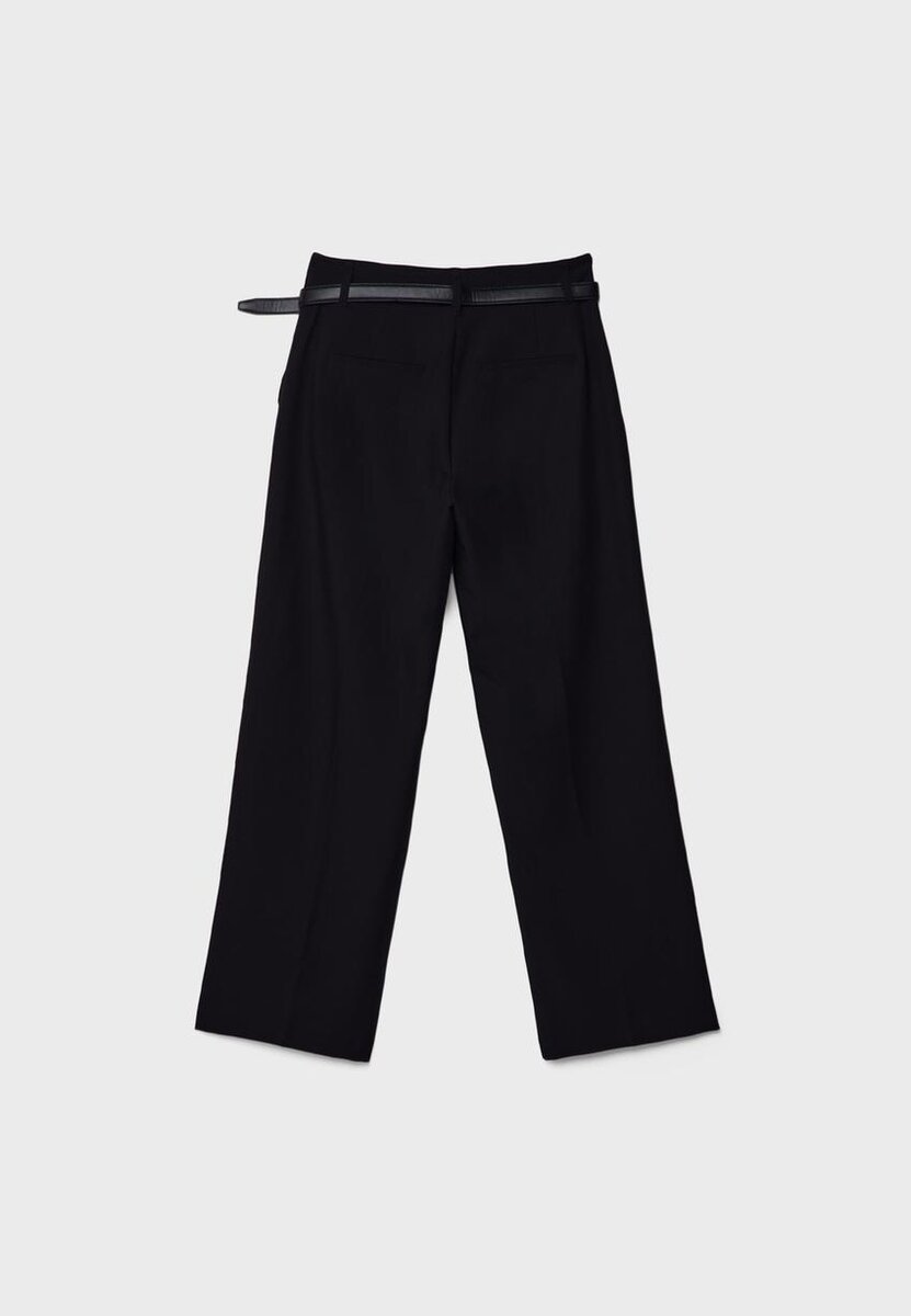 Bukser med høy midje og beltehemper. Med lommer foran, falske paspolerte lommer bak, rett ben, avtakbart belte med metallspenne og metallkrok, knapp og glidelås foran. Tilgjengelig i ulike farger.