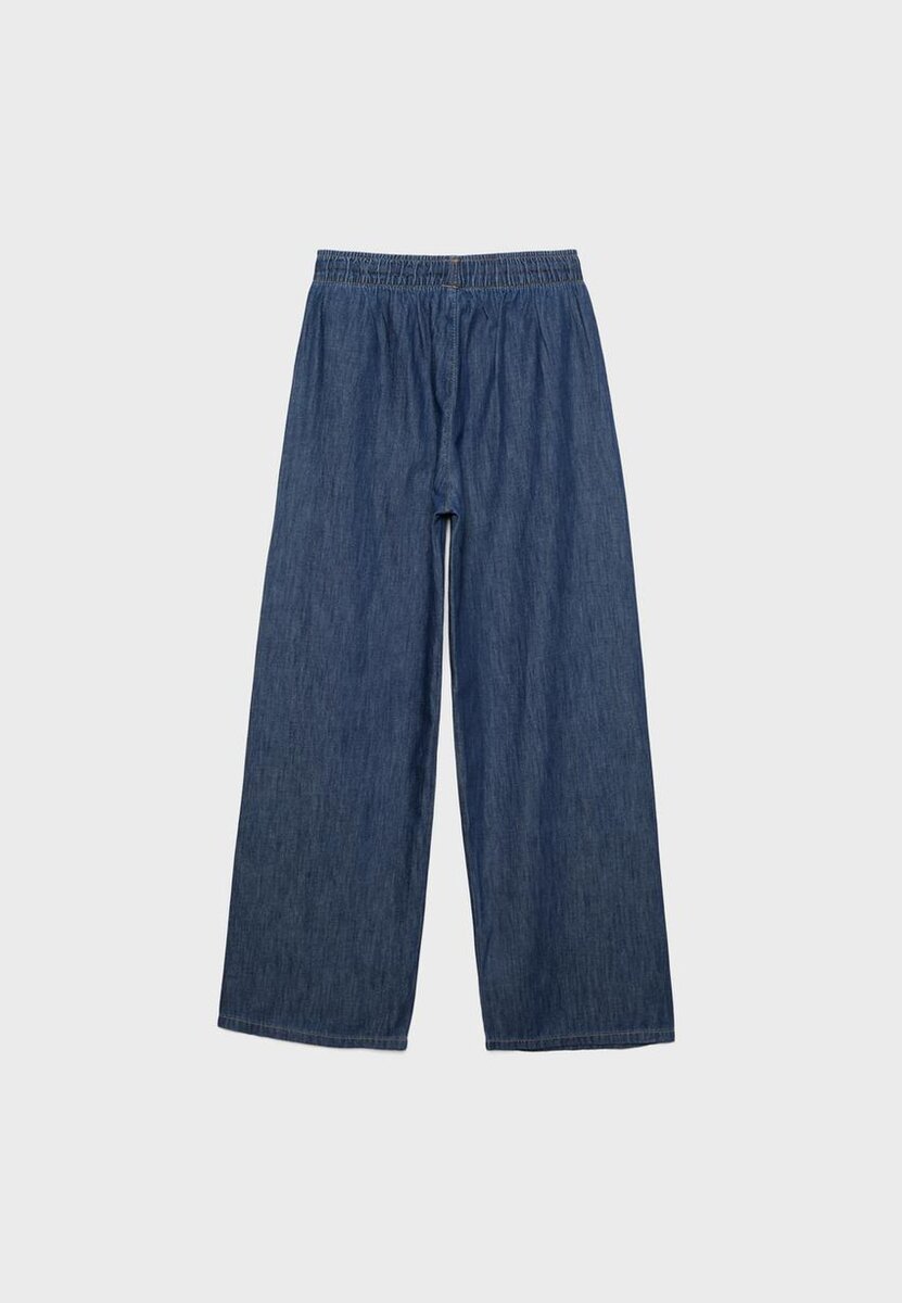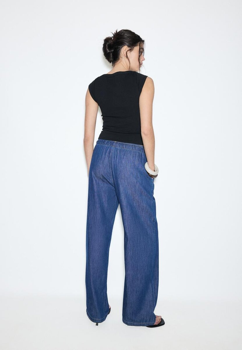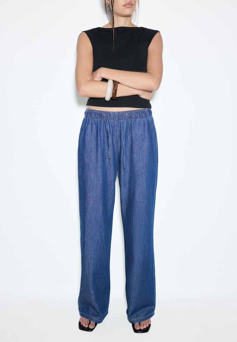 Løse denimbukser med midjehøyde og justerbar elastisk linning med matchende snøringer.