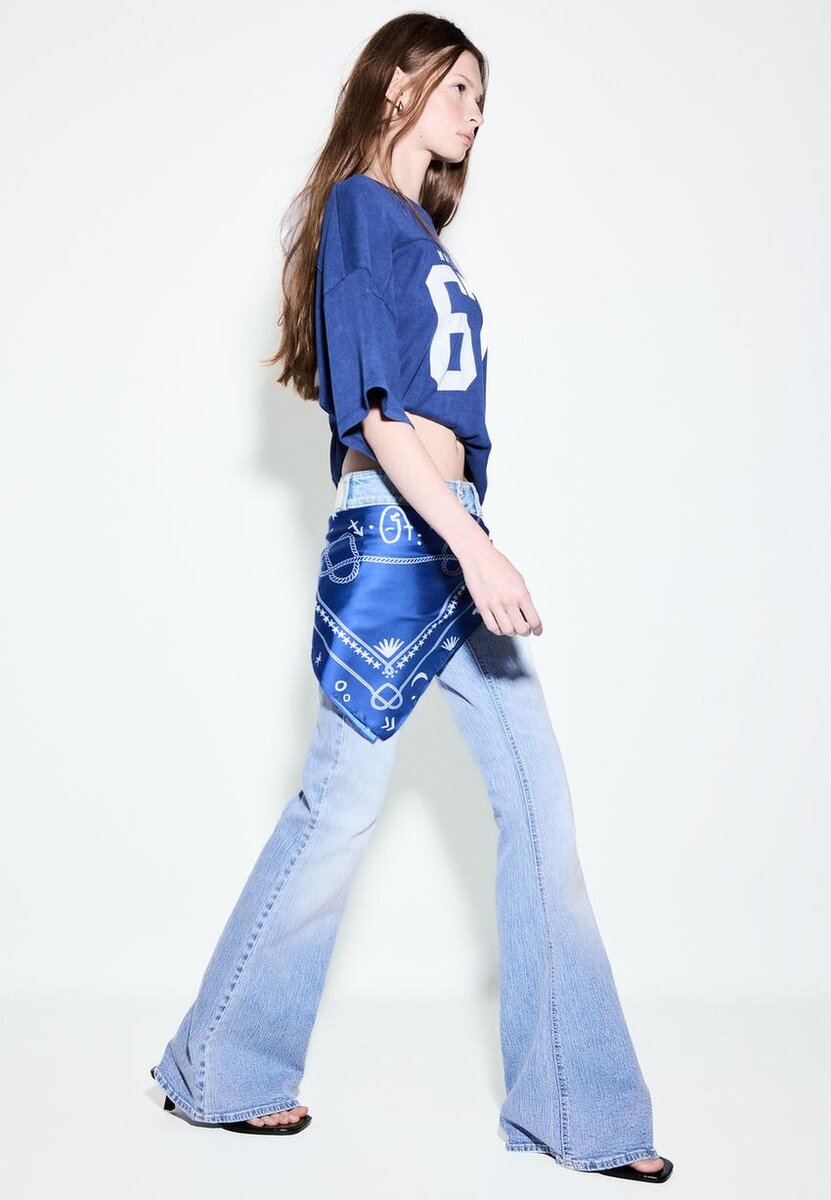 Jeans med lav midje og beltestropper. Med slim-fit Flared ben. Lommer foran og bak med synlige sømmer. Glidelås og knappelukking.