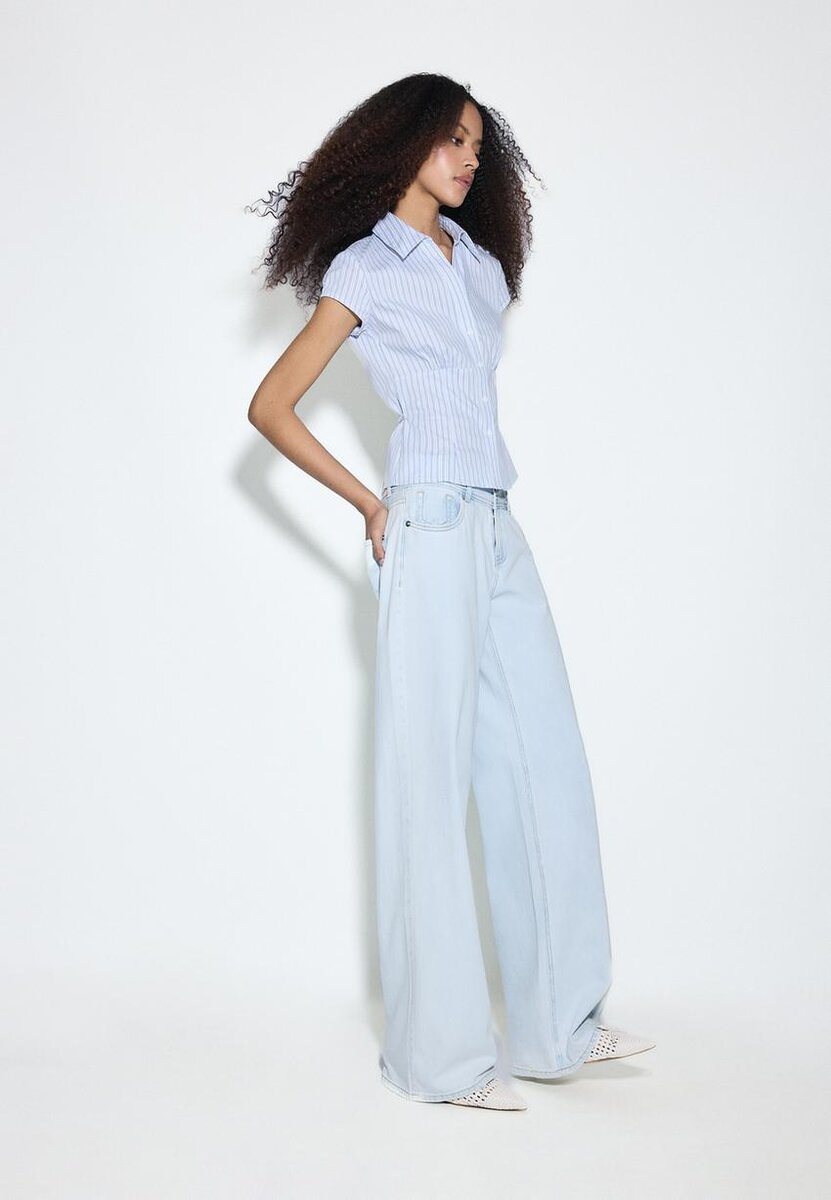 Jeans med lav midje, Wide Leg-design og beltestropper. Med lommer foran, påsydde lommer bak, rett ben og glidelås foran samt lukking med to metallknapper.