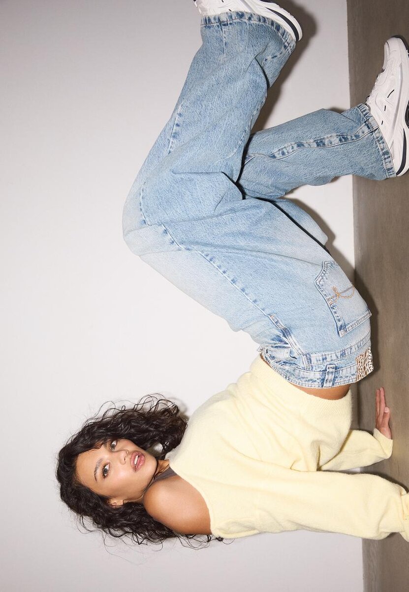 Jeans med lav midje og Wide Leg. Med belte i livet, lommer foran og påsydde lommer bak. Gylf med glidelås og knappelukking.
