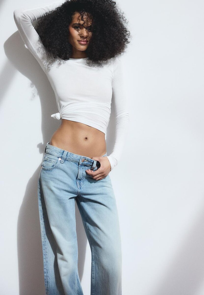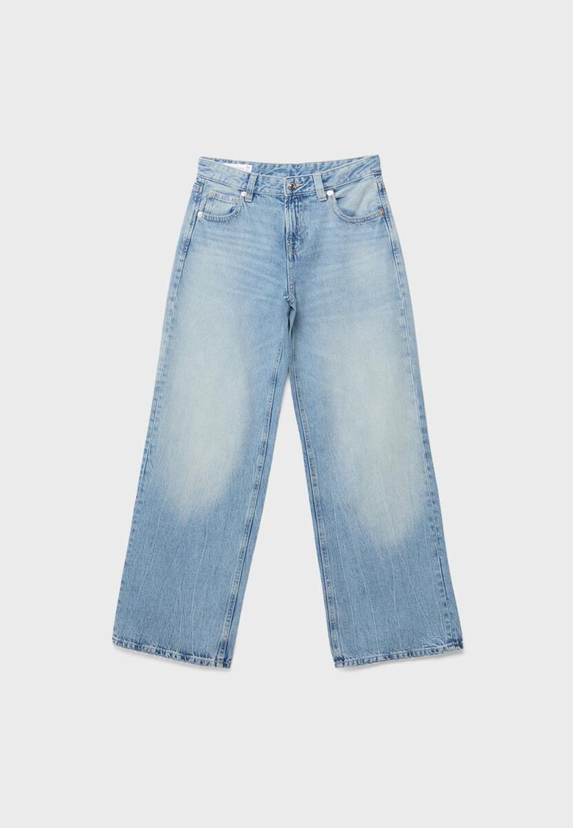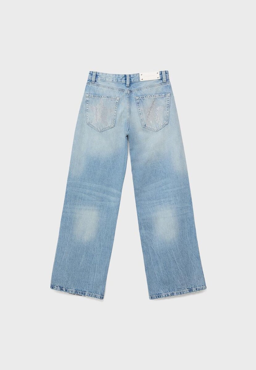 Jeans med lav midje og vide Wide Leg-ben. Med beltestropper og fem-lommers design. Glidelås og knappelukking foran. Stjernedetalj på baklommen. Tilgjengelig i ulike farger.
