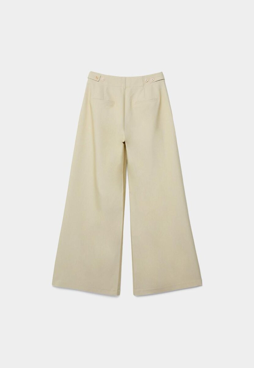 Flytende bukser med middels høy midje og justerbar linning med knapper. Med lommer foran og falske baklommer. Detaljer med innsnitt foran. Glidelås foran, knapp og metallkrok på innsiden.