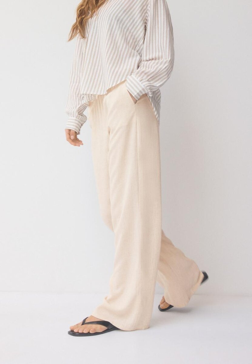 Bukser med høy midje laget av et stoff med lin-effekt. Med sidelommer og plissering foran. Knapp- og glidelåslukking.