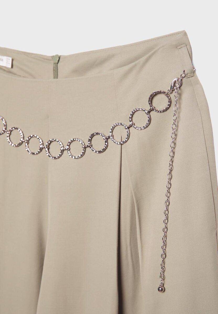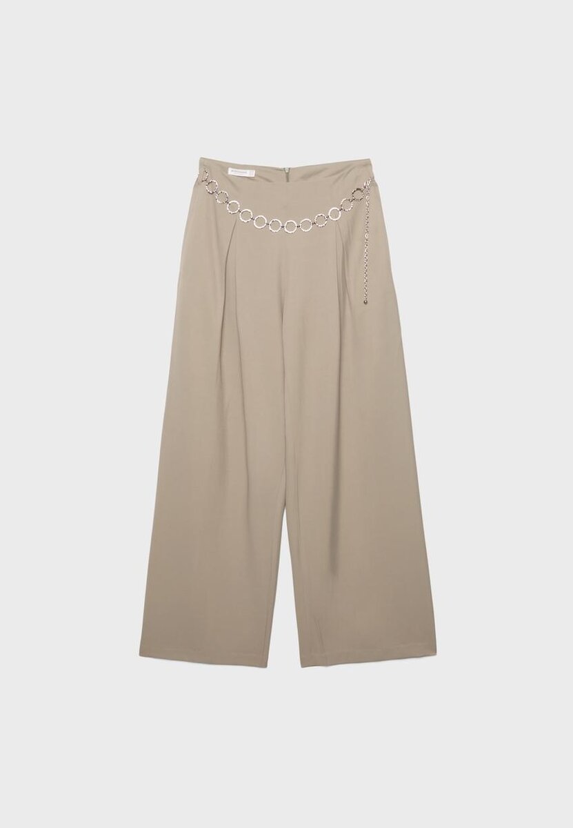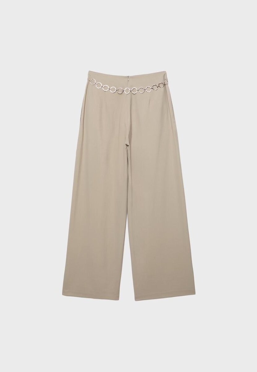 Bukser med beltestropper i livet og Wide Leg. Med innsnitt foran og usynlig glidelås bak. Med kjede som belte. Tilgjengelig i ulike farger.