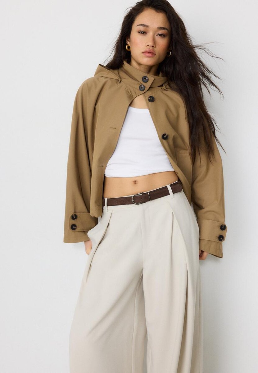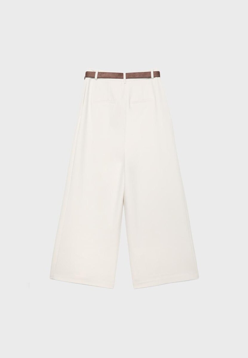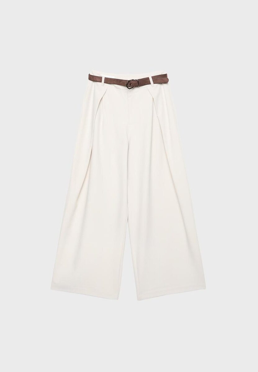 Kjoler med midjehøyde og beltestropper. Med sidelommer og falske påsydde lommer bak. Maxi-Dart-detalj foran. Bredt, rett ben. Avtakbart kontrastbelte med metallspenne. Glidelås foran, innvendig knapp og metallkrok. Tilgjengelig i ulike farger.