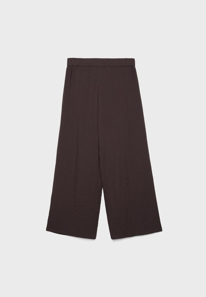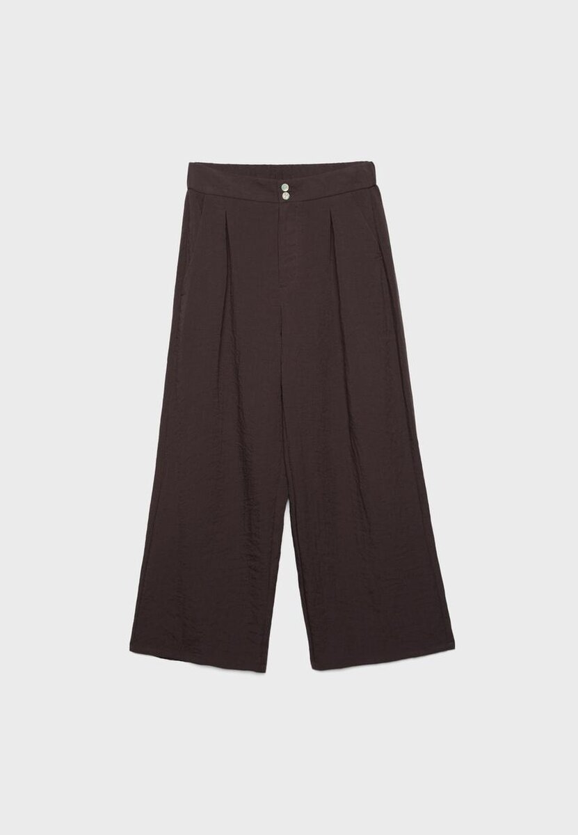 Culottes med høy midje laget av stoff med rustikk effekt. Med rette, Wide Leg-ben, dobbel knappelukking, elastisk midje bak og sidelommer. Tilgjengelig i ulike farger.