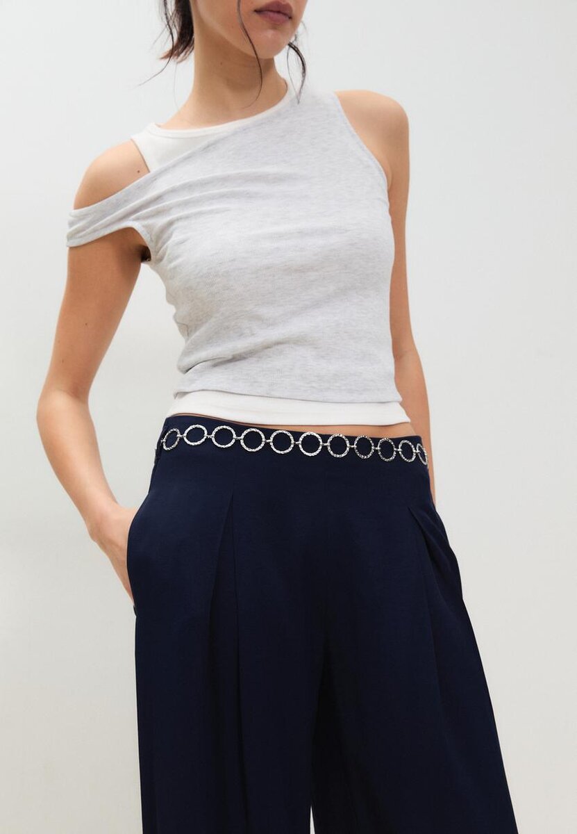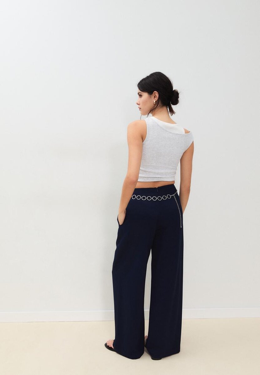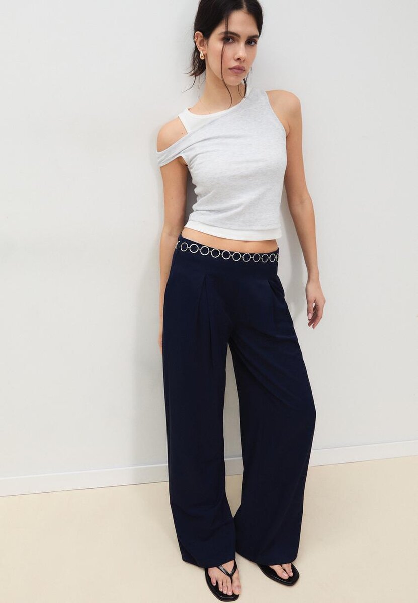 Elegante bukser med midjehøyde og beltestropper. Med innsnittdetaljer foran. Wide Leg og rett snitt. Avtakbart kjede-belte. Glidelås bak. Tilgjengelig i flere farger.