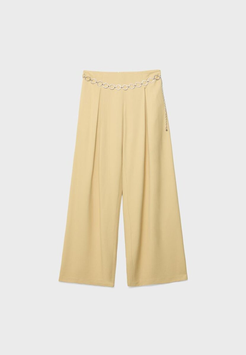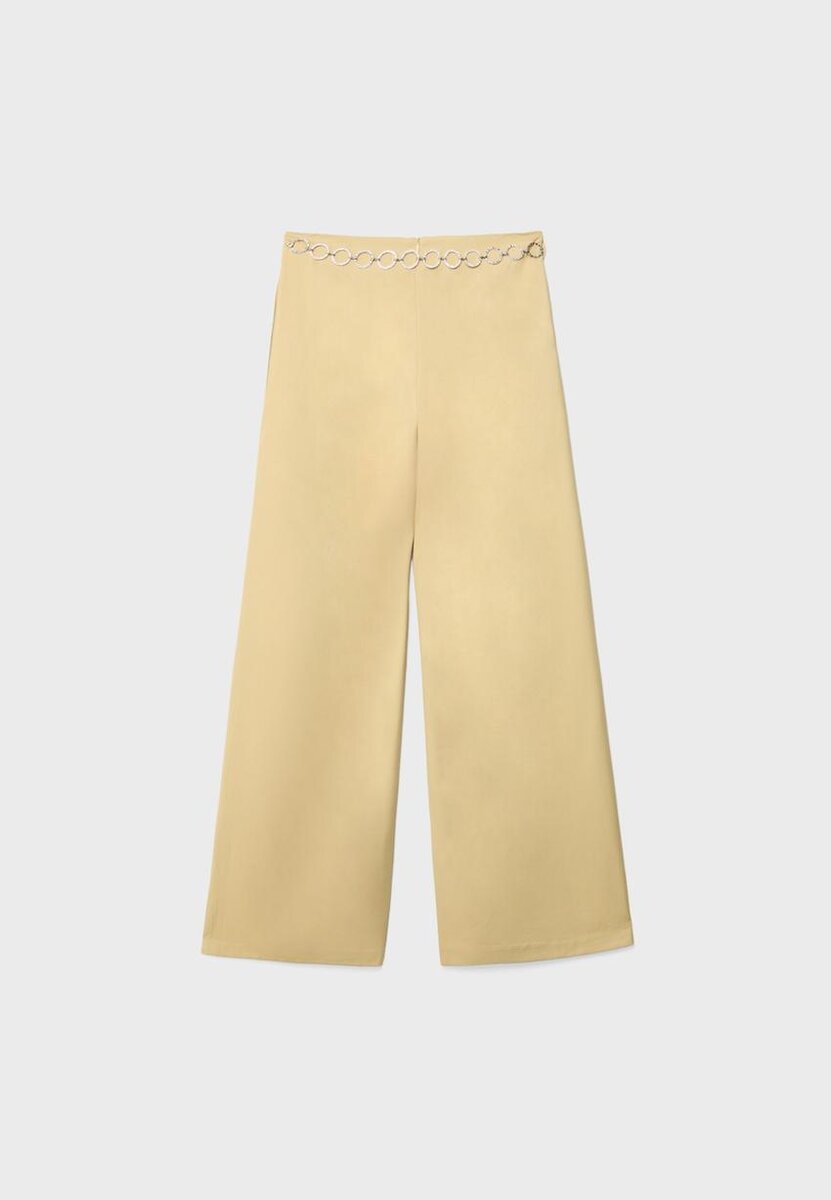 Velløpende bukser med innsnitt og beltestropper, laget av stoff med satineffekt. Har Wide Leg, usynlig glidelås bak og kjede-belte-detalj.