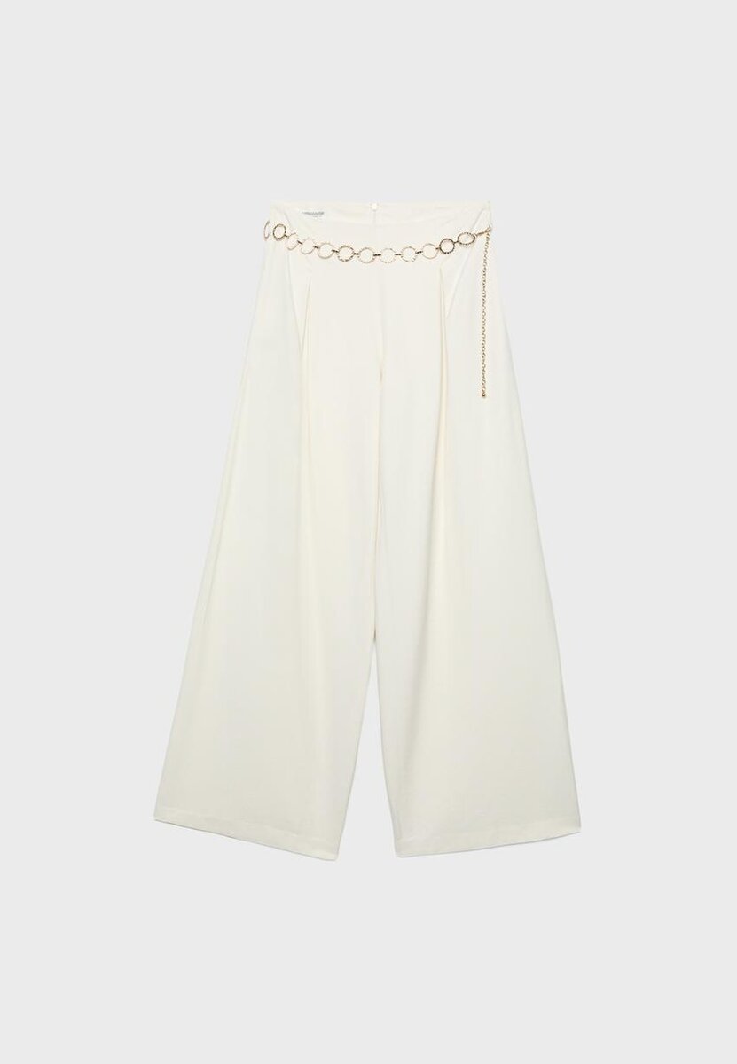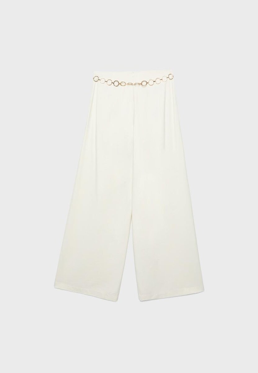 Velløpende bukser med innsnitt og beltestropper, laget av et stoff med satineffekt. Med Wide Leg-design, usynlig glidelås bak og kjede-belte-detaljer.