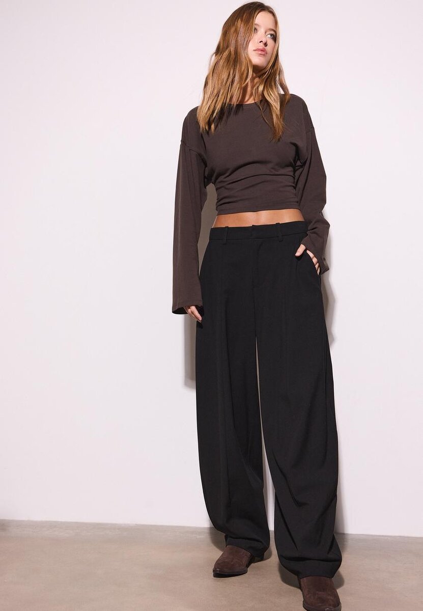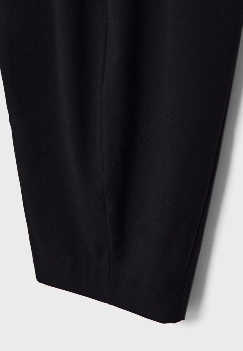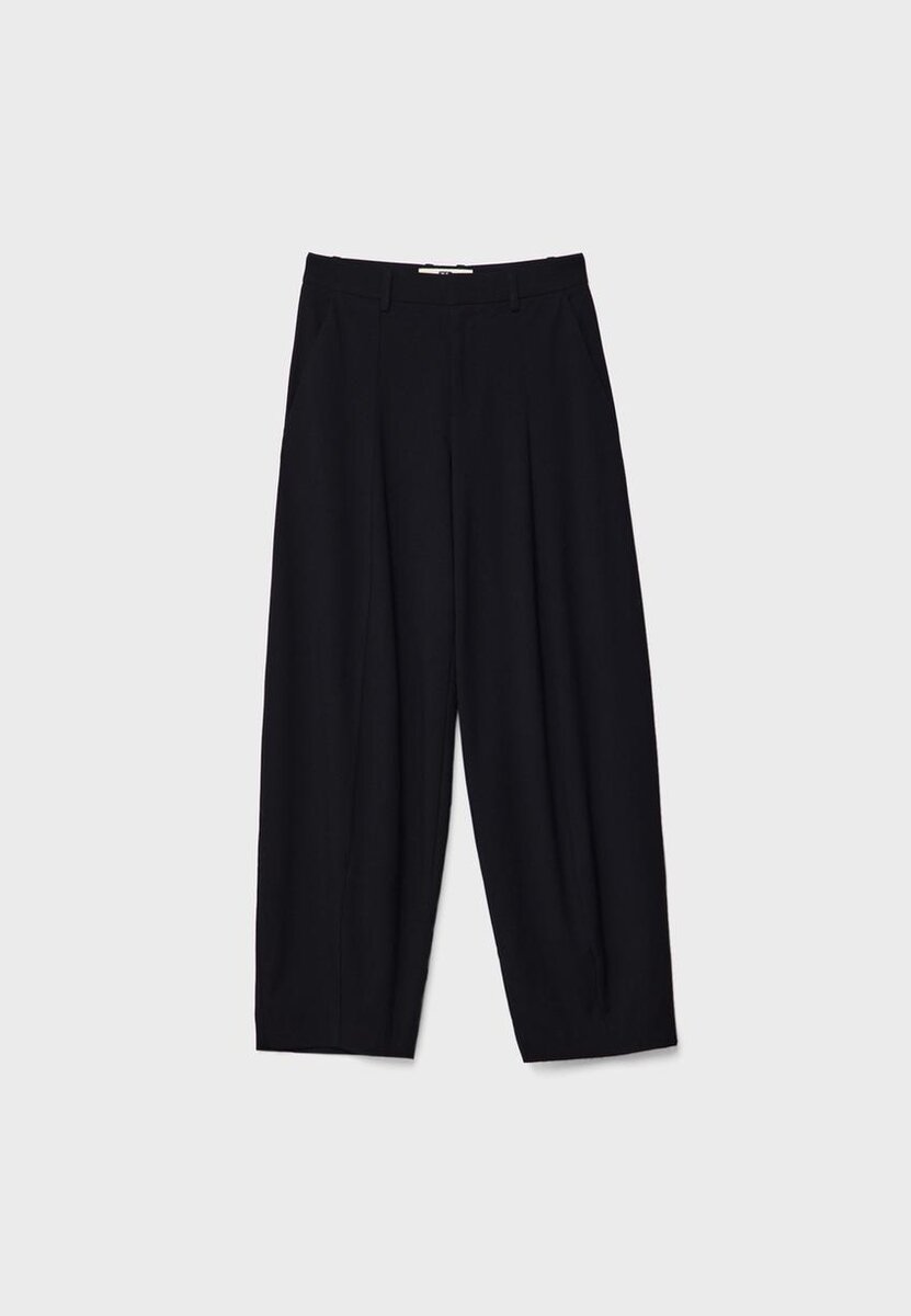 Bukser med middels høy midje og beltestropper. Sidelommer. Design med vide ben. Metallkrok, knapp på innsiden og glidelås foran.
