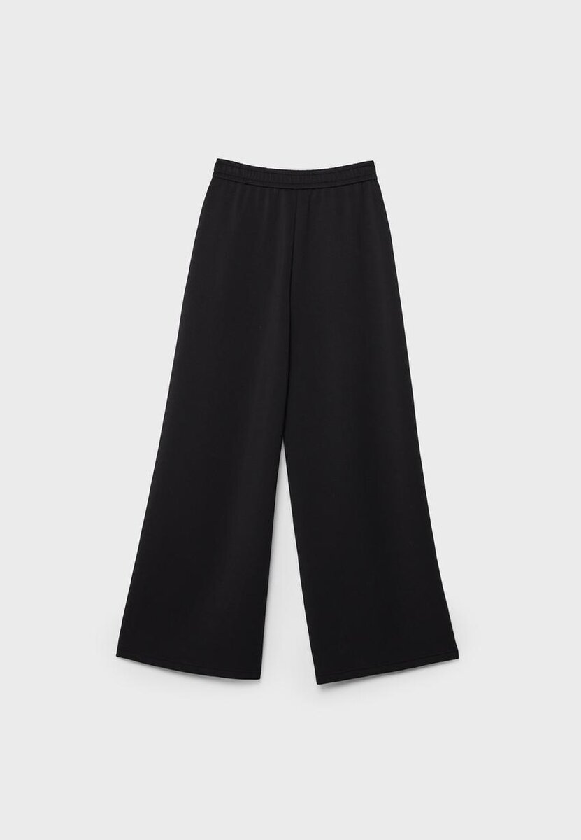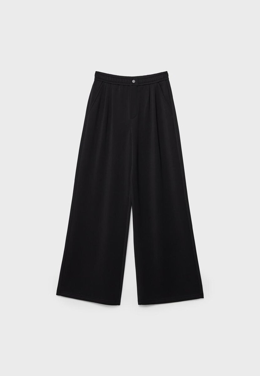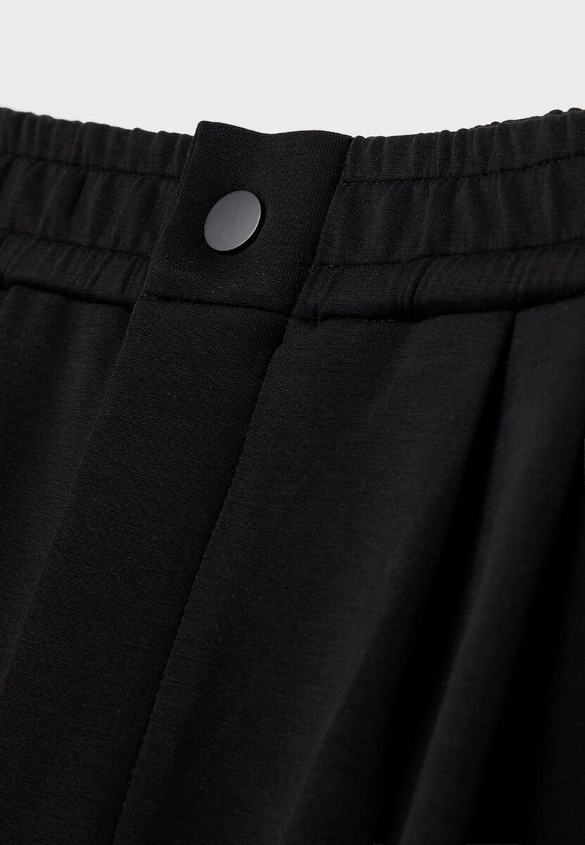 Soft-Touch-bukser. Middels høy midje med elastisk linning. Sidelommer. Innsnitt foran. Rett og løst fallende ben. Glidelås og trykknapp foran. Tilgjengelig i flere farger.