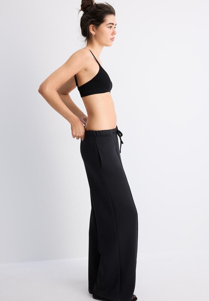 Soft-Touch Wide Leg joggebukser. Middelhøy midje med elastisk linning og justerbare snorer i samme farge. Sidelommer. Sømmdetaljer foran. Rett, Wide Leg-modell. Tilgjengelig i flere farger.